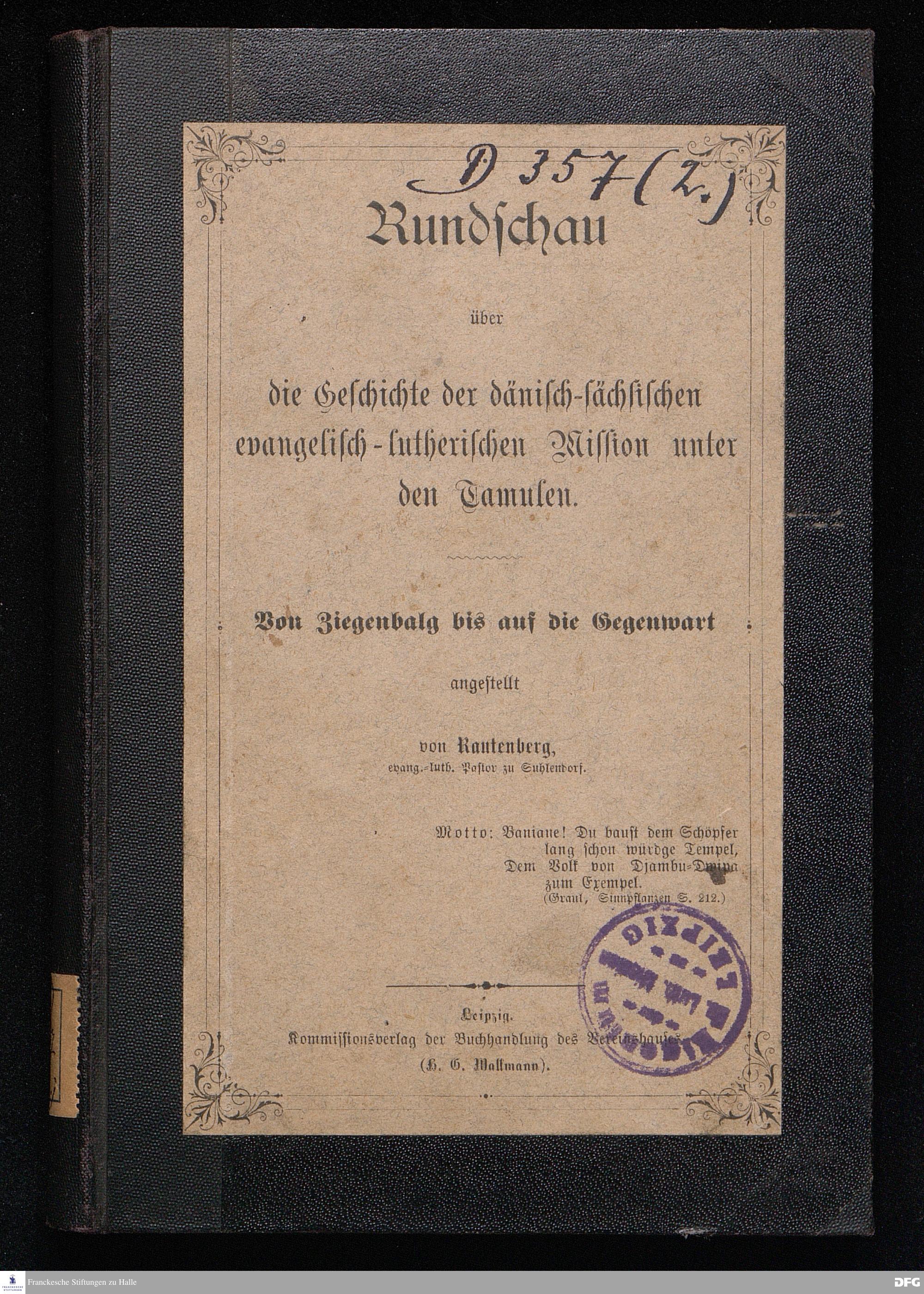 Rundschau über die Geschichte der dänisch-sächsischen evangelisch-lutherischen Mission unter den Tamulen. Von Ziegenbalg bis auf die Gegenwart.