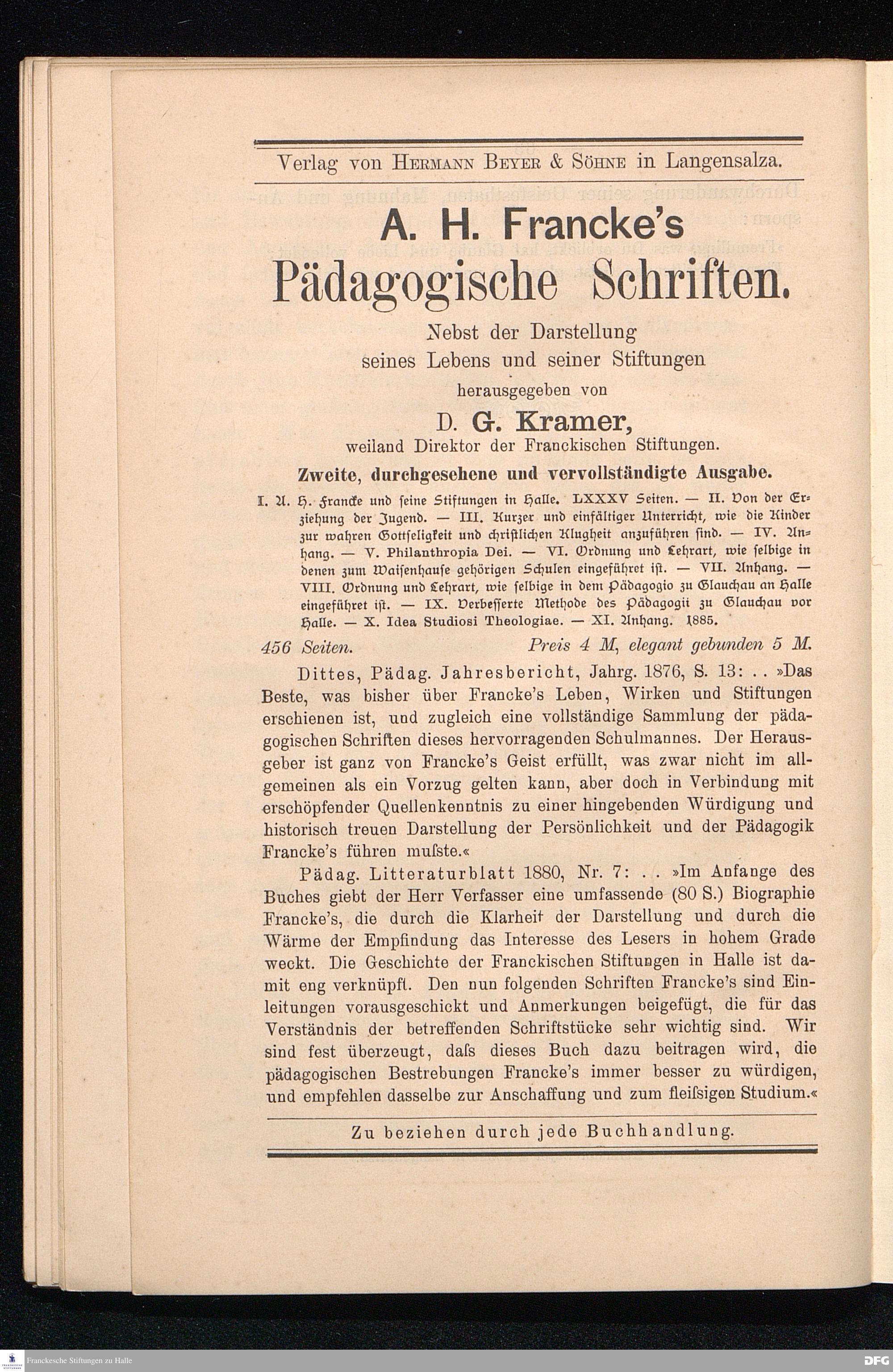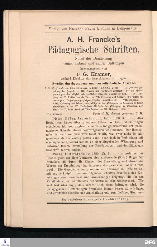August Hermann Franckes Pädagogik. Ein Gedenkblatt zur zweihundertjährigen Jubelfeier der Franckeschen Stiftungen. 1698/1898.