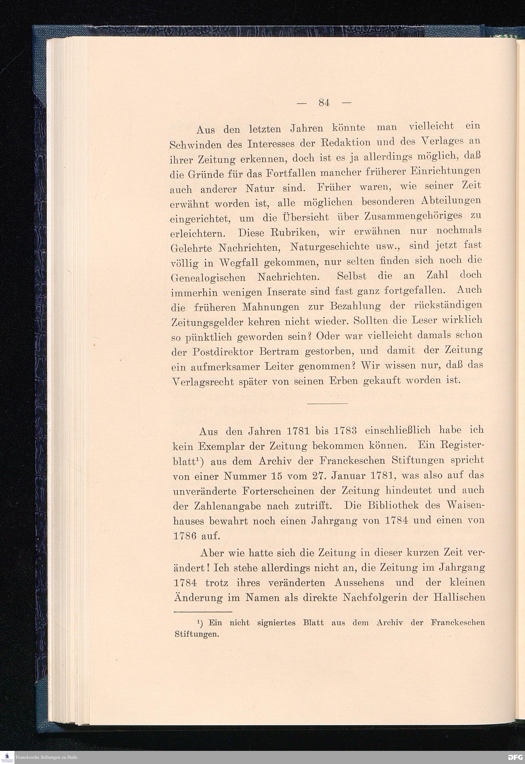 Die Geschichte der Halleschen Zeitung, Landeszeitung für die Provinz Sachsen, für Anhalt und Thüringen. Eine Denkschrift aus Anlaß des 200jährigen Bestehens der Zeitung am 25. Juni 1908.