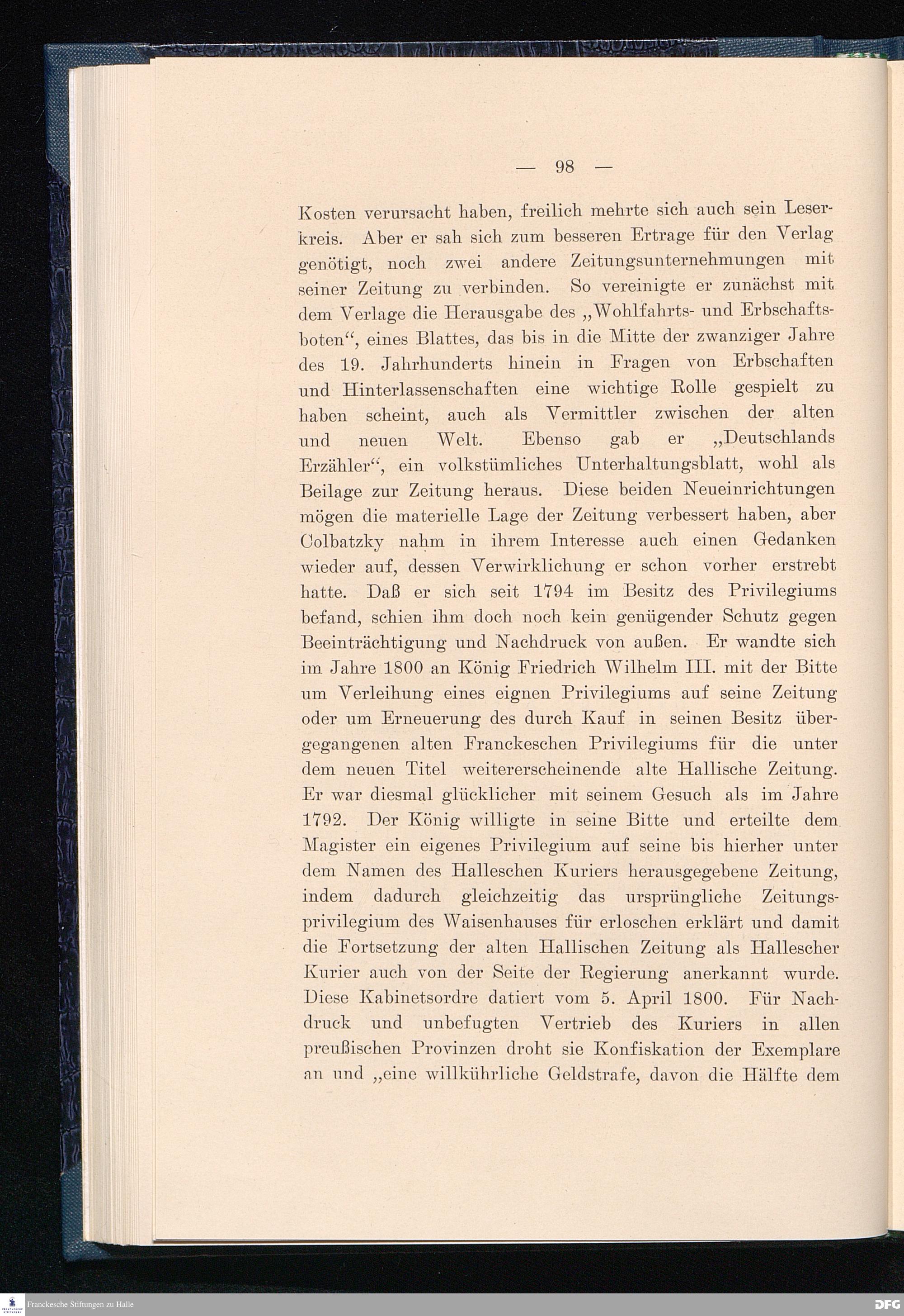 Die Geschichte der Halleschen Zeitung, Landeszeitung für die Provinz Sachsen, für Anhalt und Thüringen. Eine Denkschrift aus Anlaß des 200jährigen Bestehens der Zeitung am 25. Juni 1908.