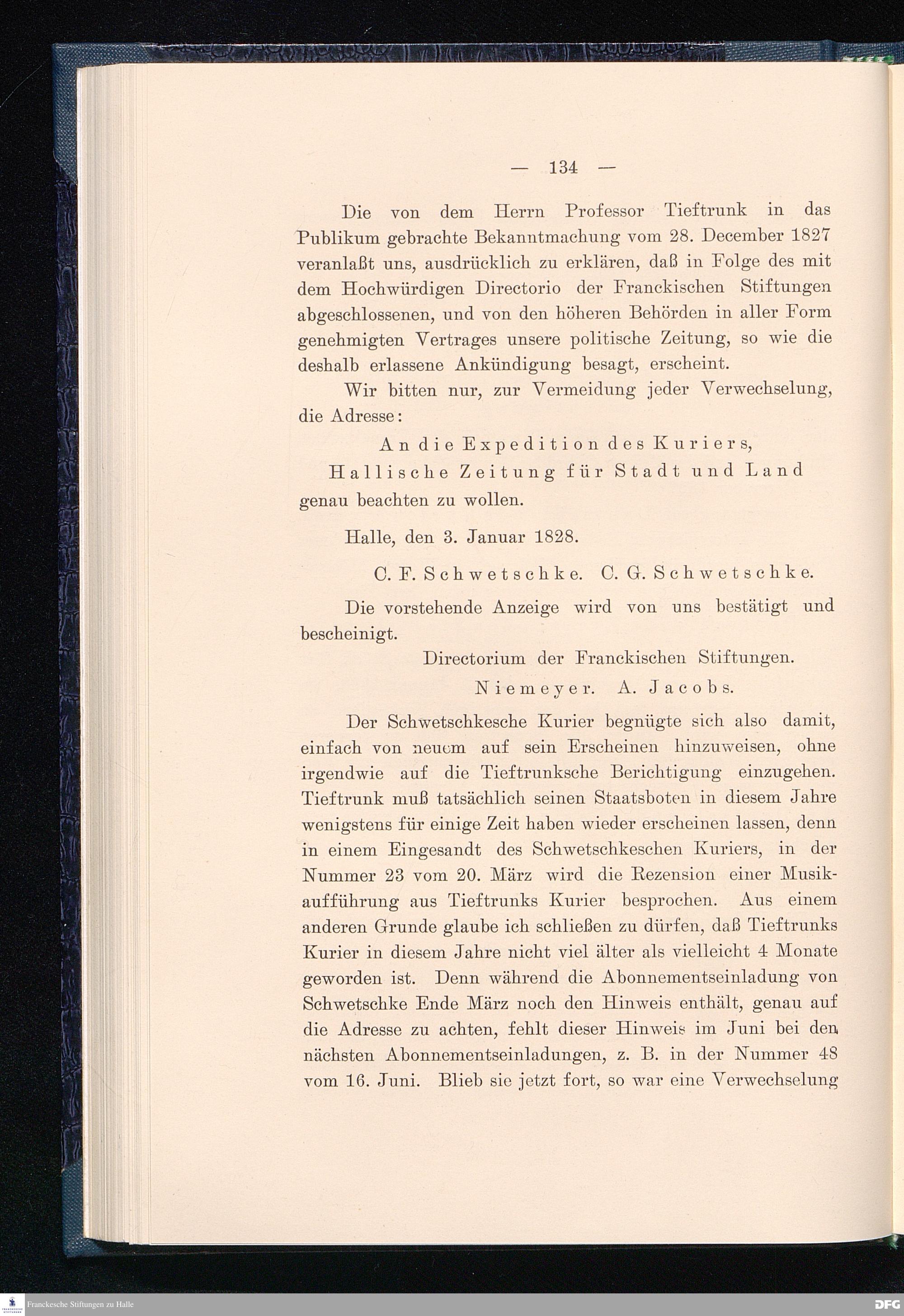 Die Geschichte der Halleschen Zeitung, Landeszeitung für die Provinz Sachsen, für Anhalt und Thüringen. Eine Denkschrift aus Anlaß des 200jährigen Bestehens der Zeitung am 25. Juni 1908.