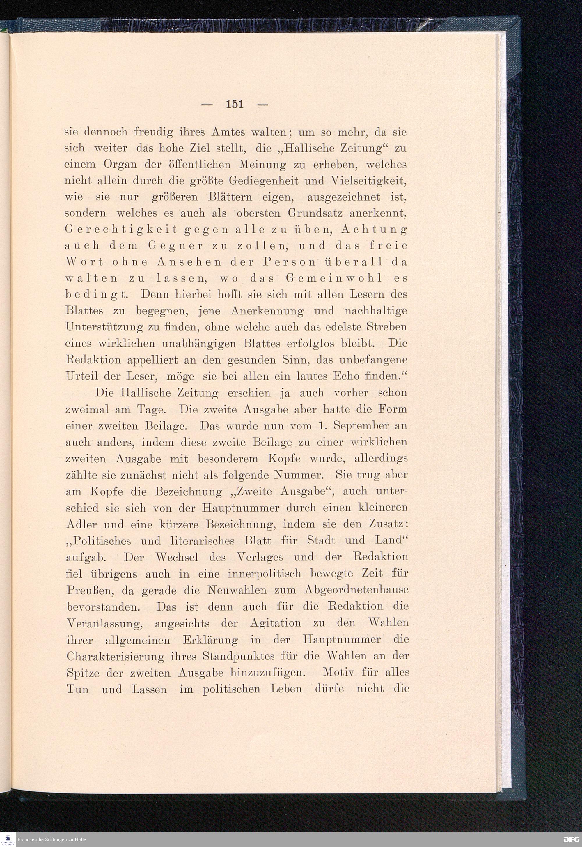Die Geschichte der Halleschen Zeitung, Landeszeitung für die Provinz Sachsen, für Anhalt und Thüringen. Eine Denkschrift aus Anlaß des 200jährigen Bestehens der Zeitung am 25. Juni 1908.