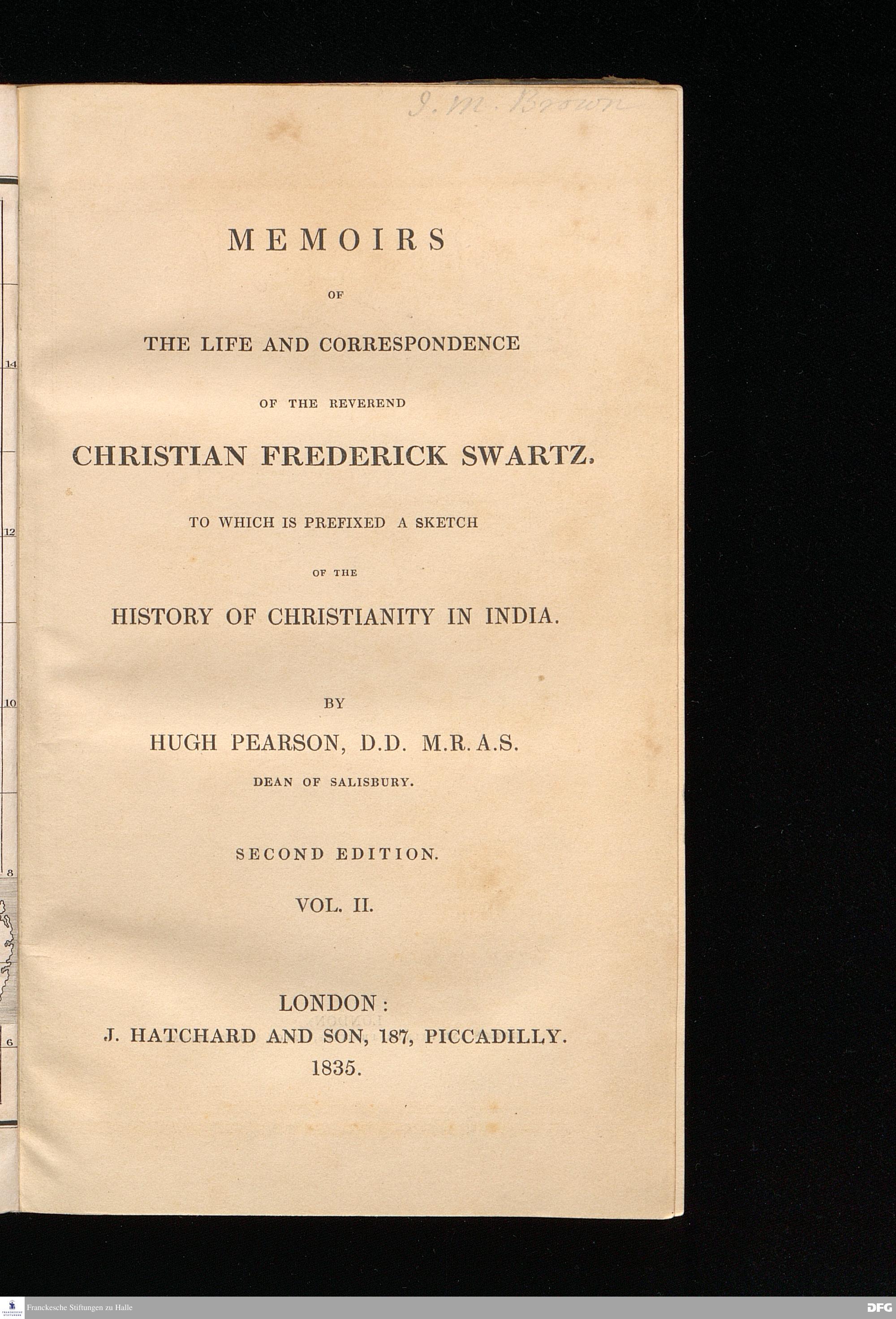 Memoirs of the life and correspondence of the reverend Christian Frederick Swartz. To which is prefixed a sketch of the history of christianity in India.
