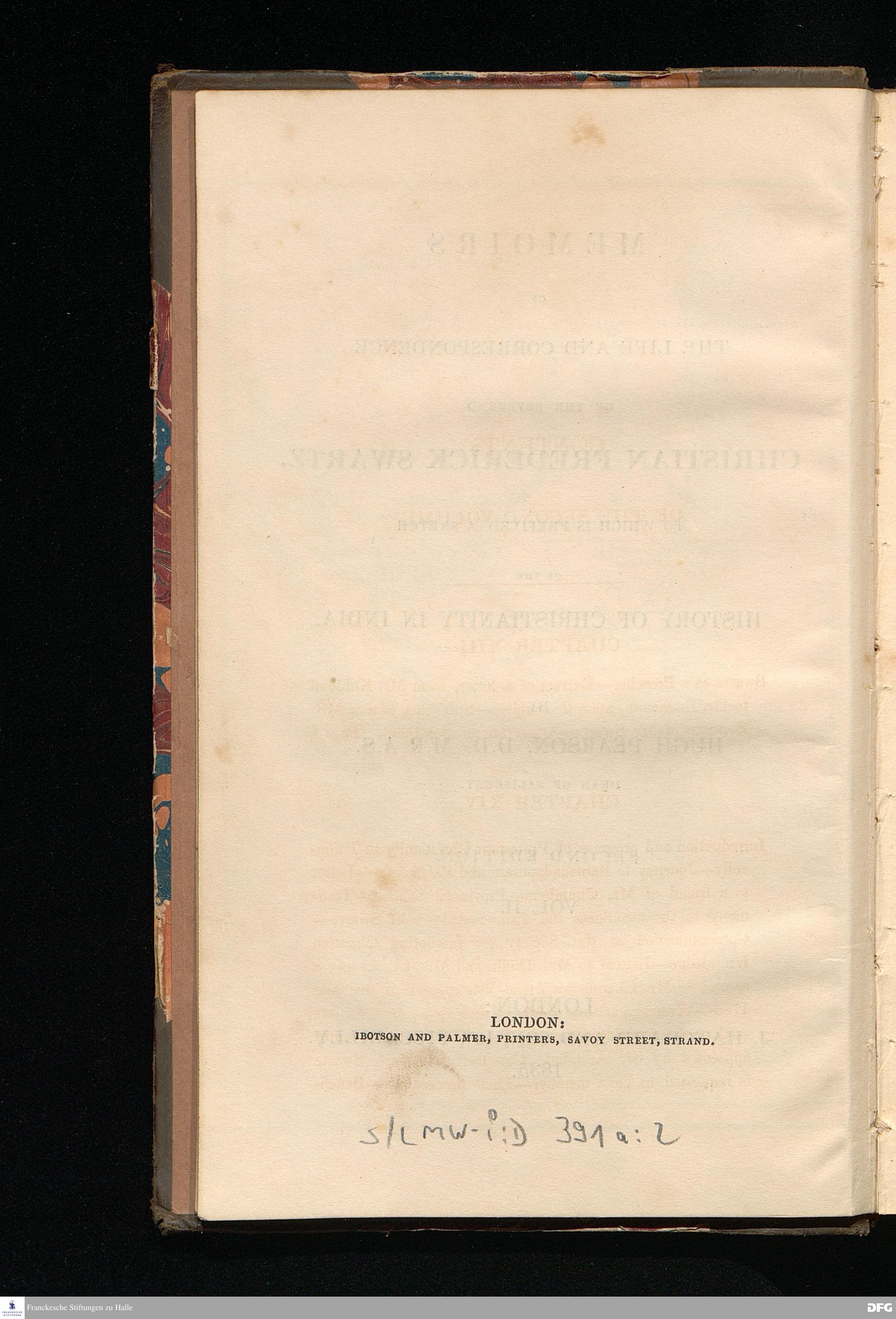 Memoirs of the life and correspondence of the reverend Christian Frederick Swartz.... SECOND EDITION. VOL. 2. Titelblatt
