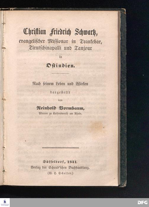 Christian Friedrich Schwartz, evangelischer Missionar in Trankebar, Tiruschinapalli und Tanjour in Ostindien. Nach seinem Leben und Wirken dargest..