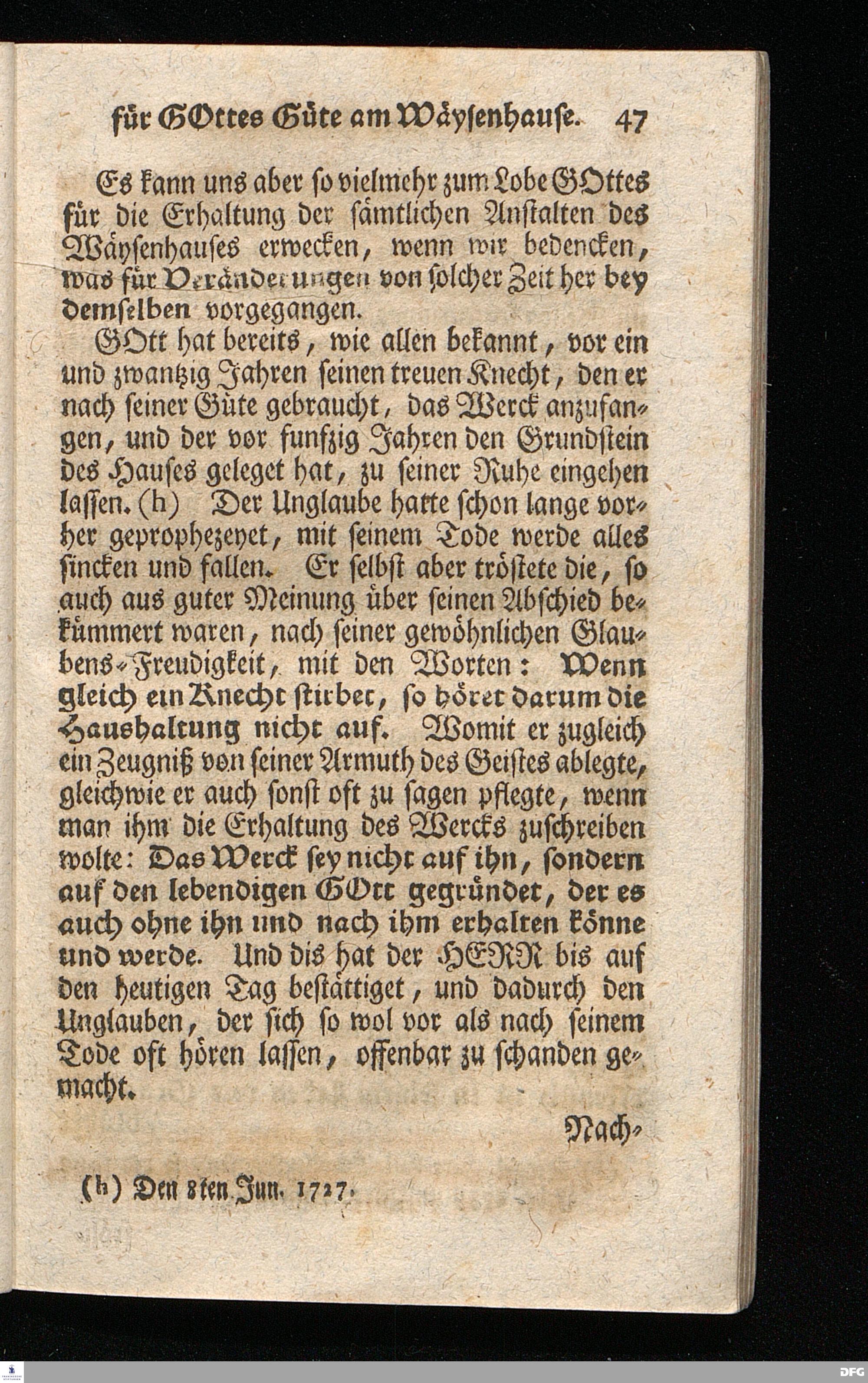 Schuldiges Lob- und Danck-Opfer für die Güte und Wohlthaten Gottes, so derselbe an dem Wäysenhause zu Glaucha an Halle seitdem der Grundstein zu demselben vor funfzig Jahren geleget worden, bis hieher reichlich erzeiget hat, den 24.sten Jul. 1748.