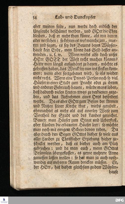 Schuldiges Lob- und Danck-Opfer für die Güte und Wohlthaten Gottes, so derselbe an dem Wäysenhause zu Glaucha an Halle seitdem der Grundstein zu demselben vor funfzig Jahren geleget worden, bis hieher reichlich erzeiget hat, den 24.sten Jul. 1748.