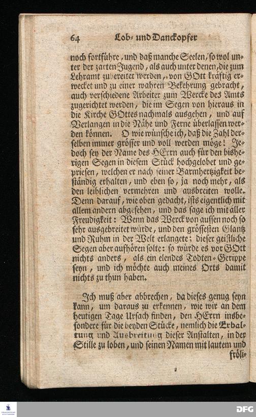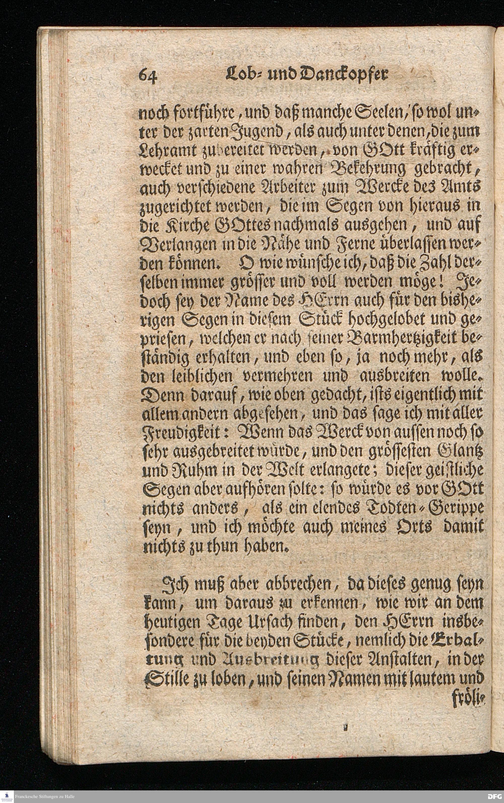 Schuldiges Lob- und Danck-Opfer für die Güte und Wohlthaten Gottes, so derselbe an dem Wäysenhause zu Glaucha an Halle seitdem der Grundstein zu demselben vor funfzig Jahren geleget worden, bis hieher reichlich erzeiget hat, den 24.sten Jul. 1748.