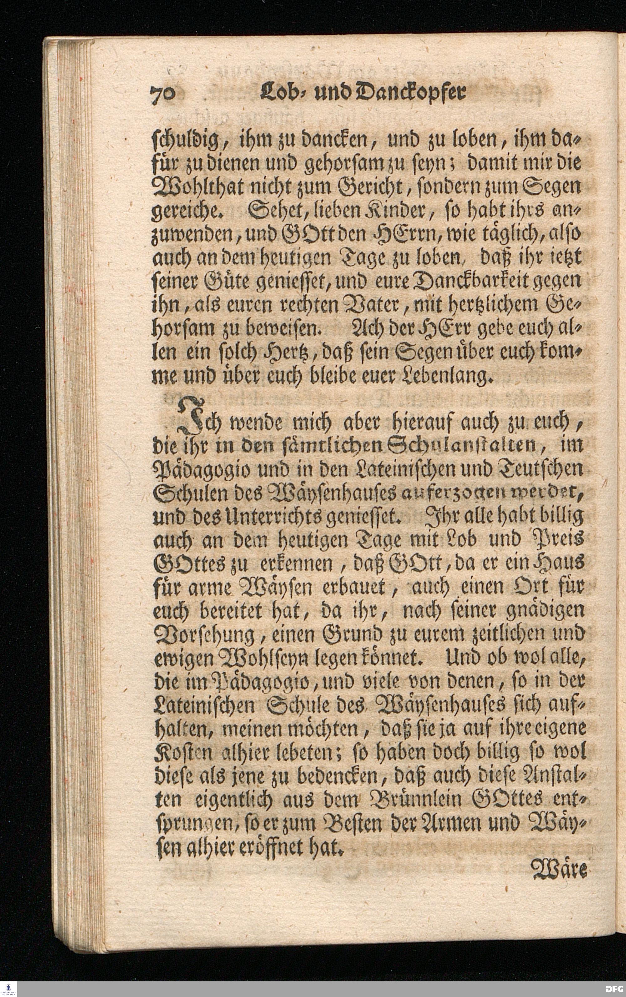 Schuldiges Lob- und Danck-Opfer für die Güte und Wohlthaten Gottes, so derselbe an dem Wäysenhause zu Glaucha an Halle seitdem der Grundstein zu demselben vor funfzig Jahren geleget worden, bis hieher reichlich erzeiget hat, den 24.sten Jul. 1748.