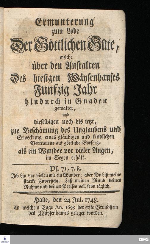 Schuldiges Lob- und Danck-Opfer für die Güte und Wohlthaten Gottes, so derselbe an dem Wäysenhause zu Glaucha an Halle seitdem der Grundstein zu demselben vor funfzig Jahren geleget worden, bis hieher reichlich erzeiget hat, den 24.sten Jul. 1748.