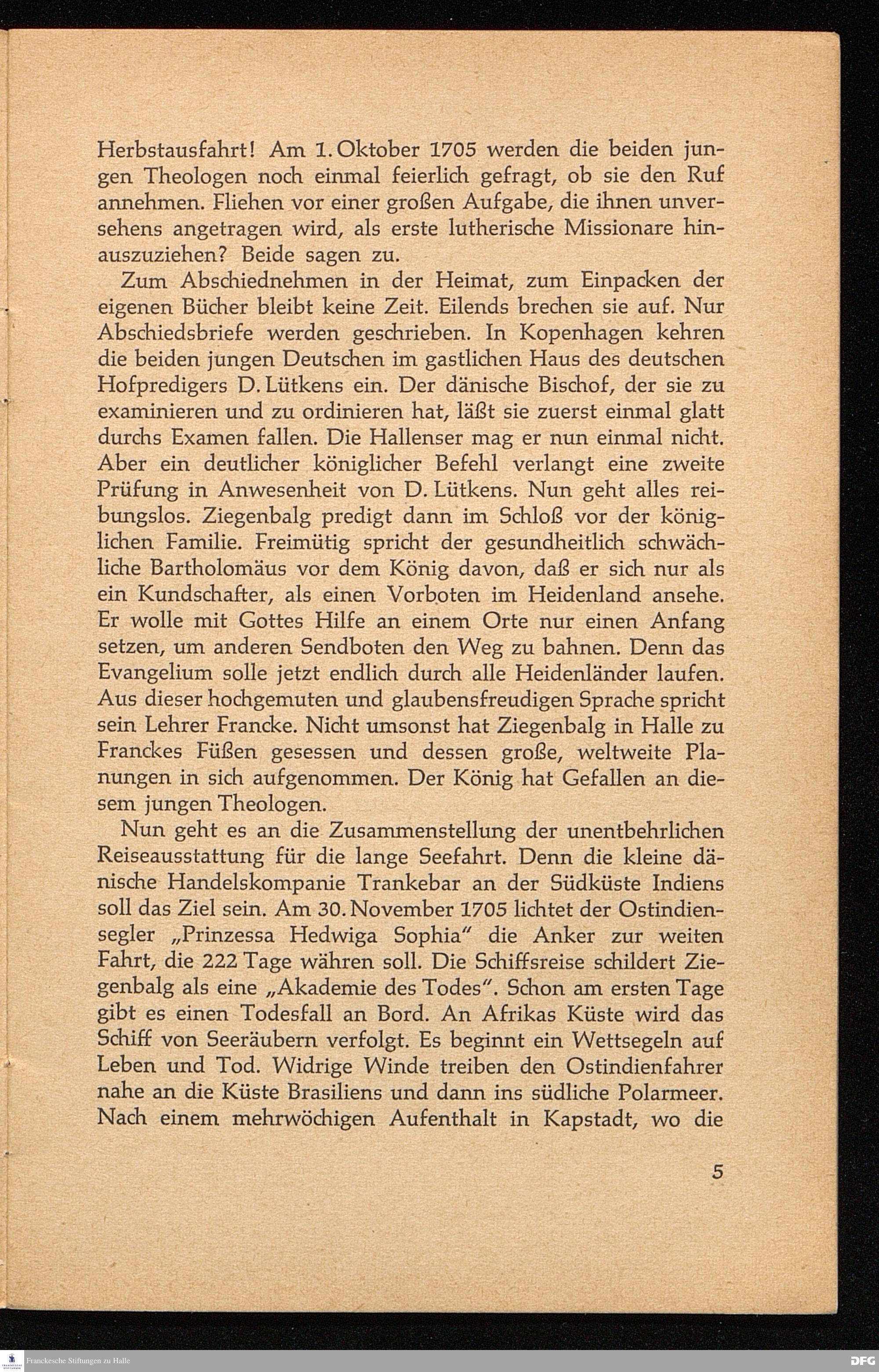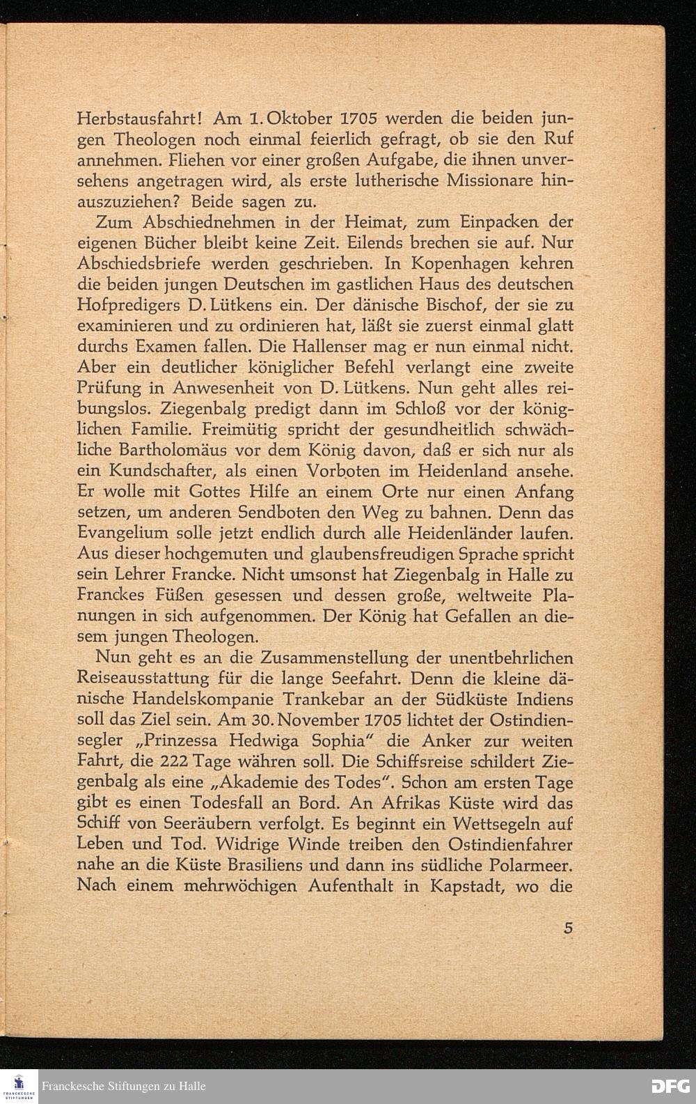 Bartholomäus Ziegenbalg. Der erste deutsche Missionar in Indien. Zum 250. Jahrestag seiner Ausreise.