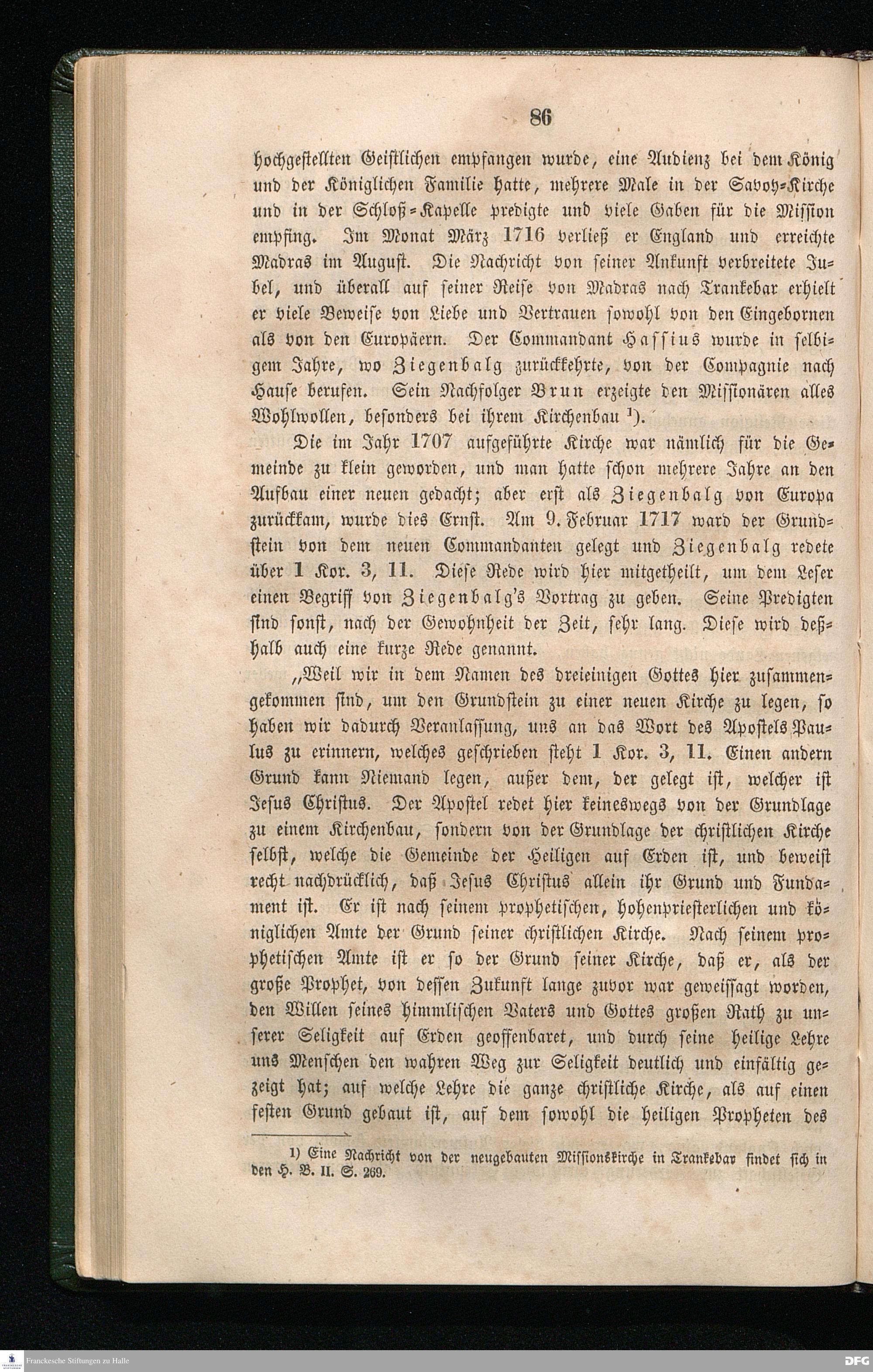 Siebentes Kapitel. Plütschau reist nach Hause. - Ziegenbalgs Besuch in Europa und Zurückkunft nach Trankebar. - Die Neu-Jerusalemskirche wird erbaut. - Ziegenbalgs Rede bei ihrer Grundlegung.