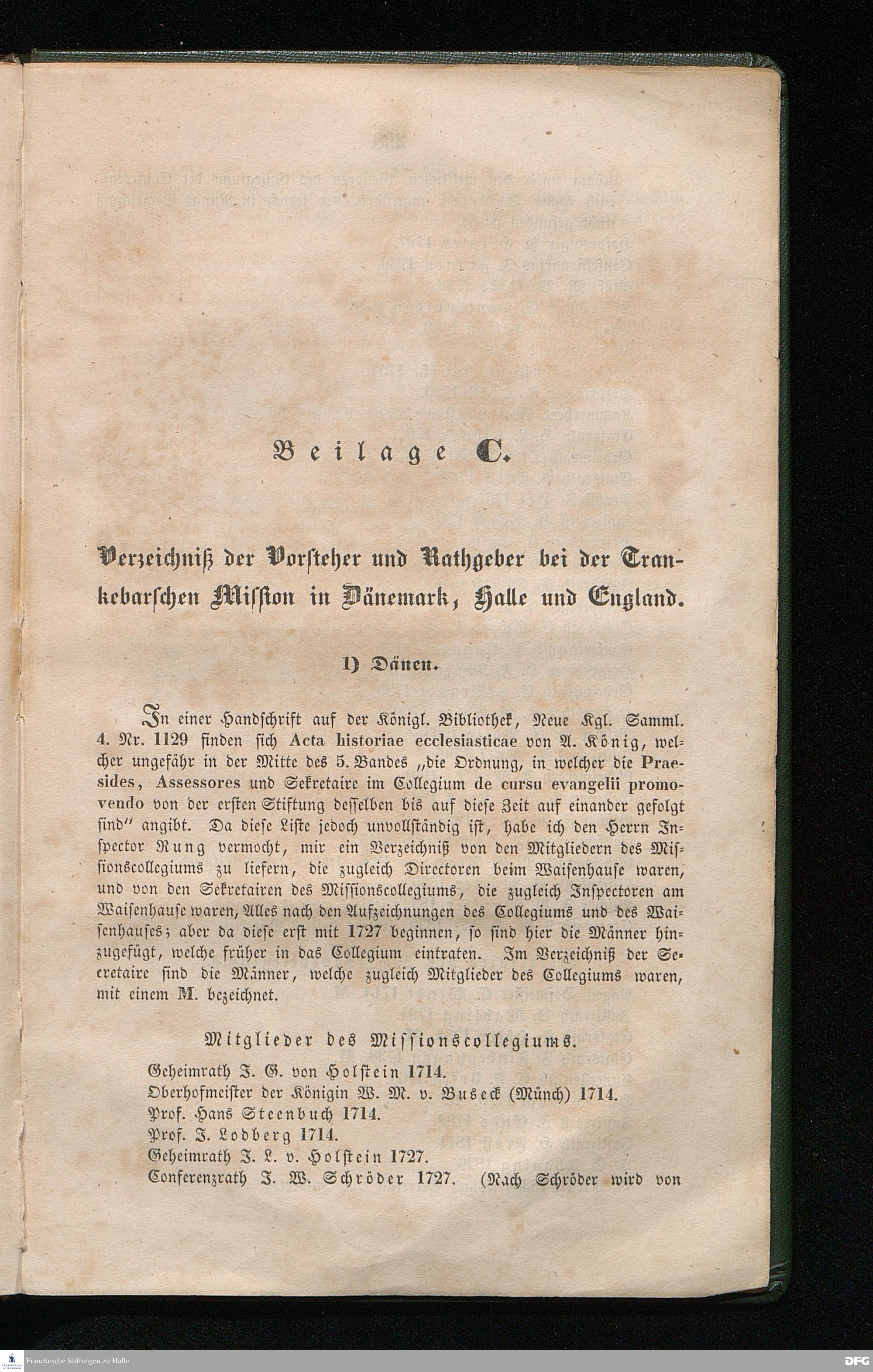Beilage C. Verzeichniß der Vorsteher und Rathgeber bei der Trankebarschen Mission in Dänemark, Halle und England.