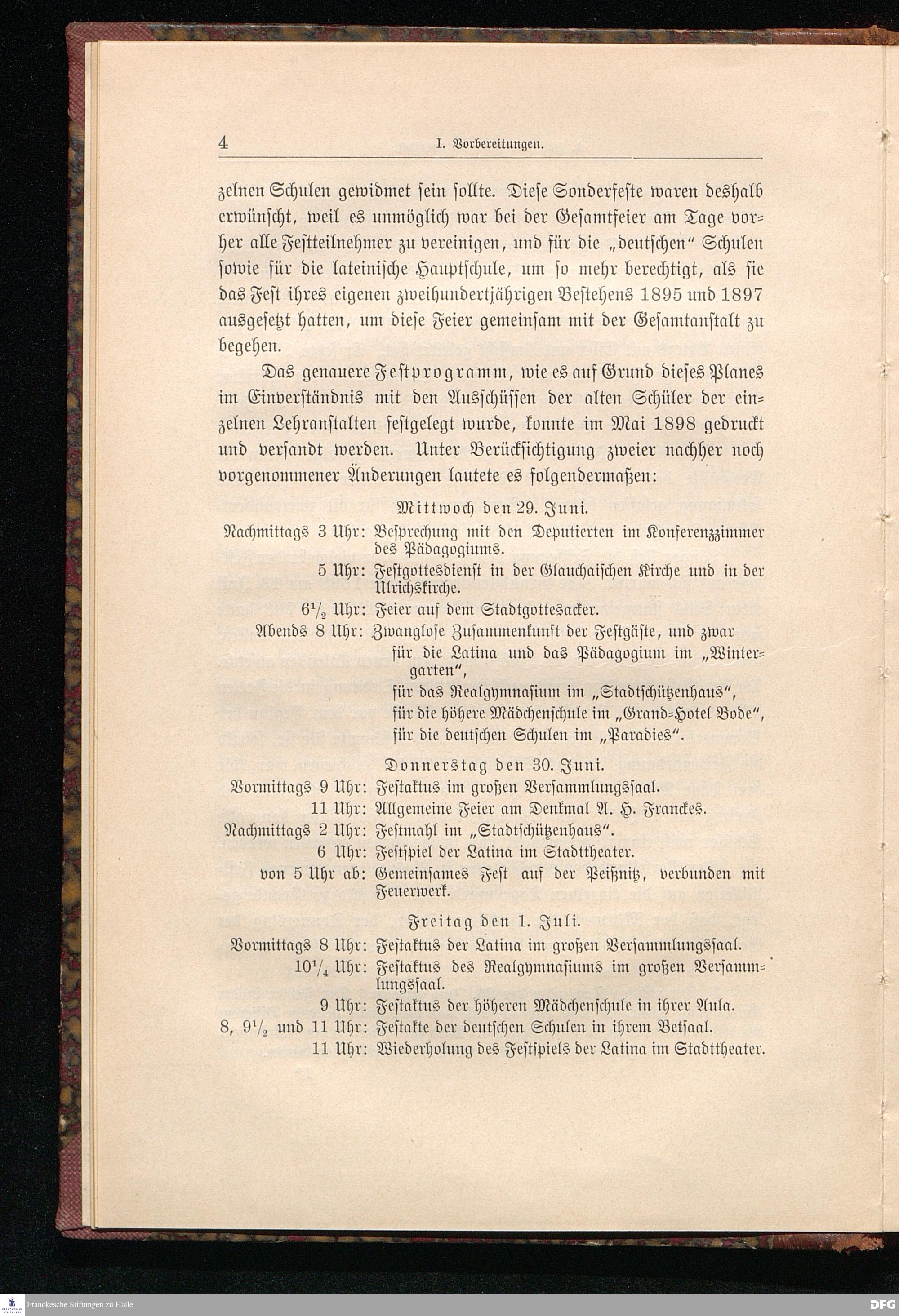 Bericht über die zweihundertjährige Jubelfeier der Franckeschen Stiftungen am 29., 30. Juni und 1. Juli 1898.