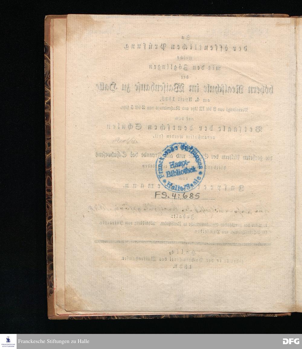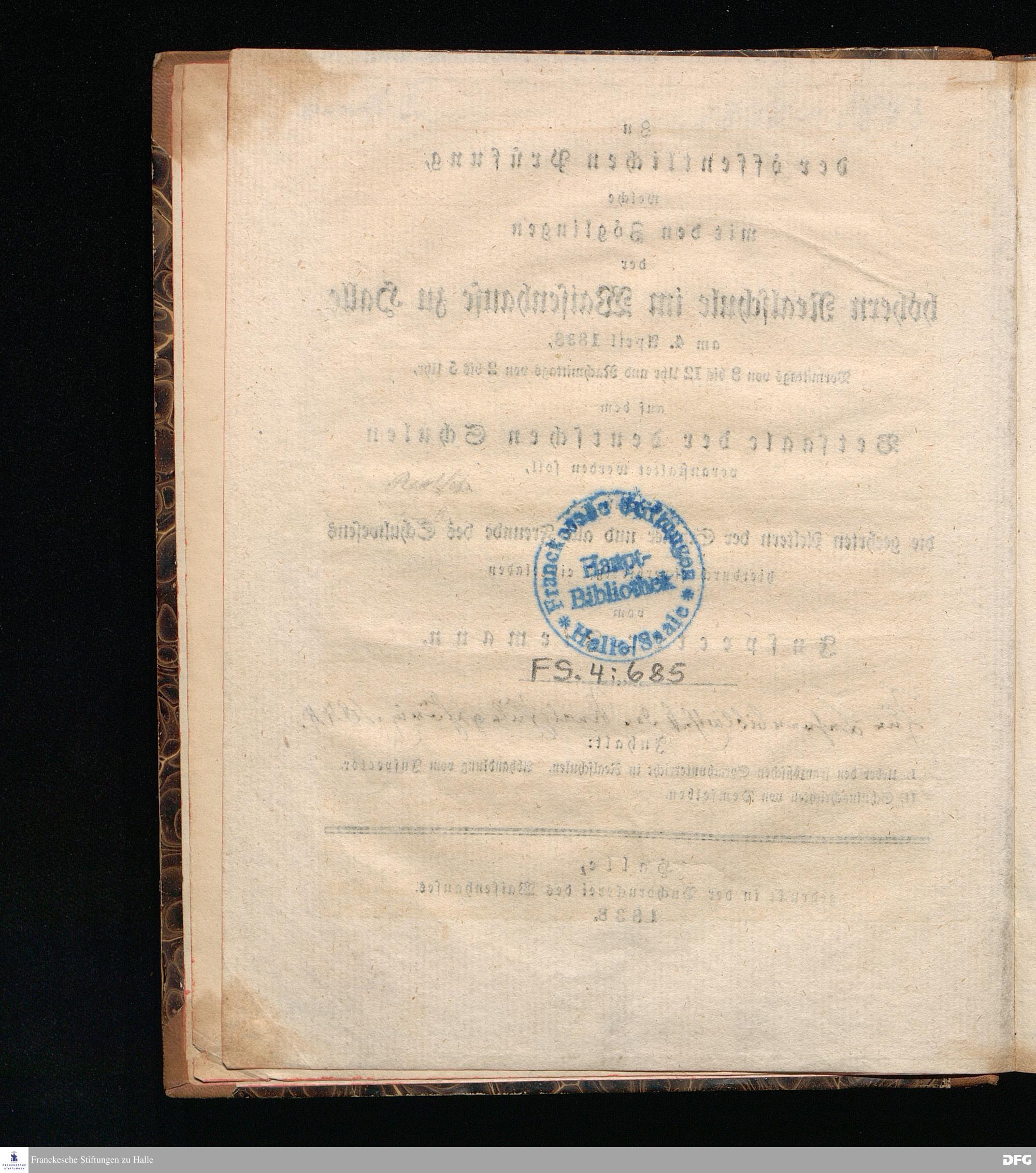 Zu der öffentlichen Prüfung, welche mit den Zöglingen der Realschule I. Ordnung im Waisenhause zu Halle am ... in dem Versammlungssaale des neuen Realschulgebäudes veranstaltet werden soll, werden ... eingeladen.