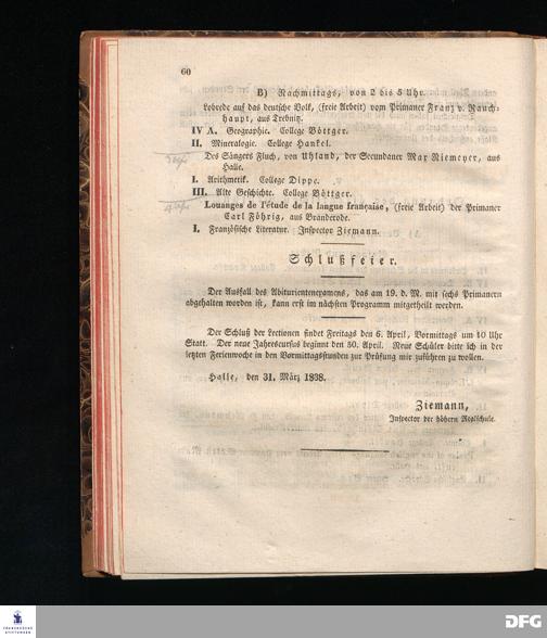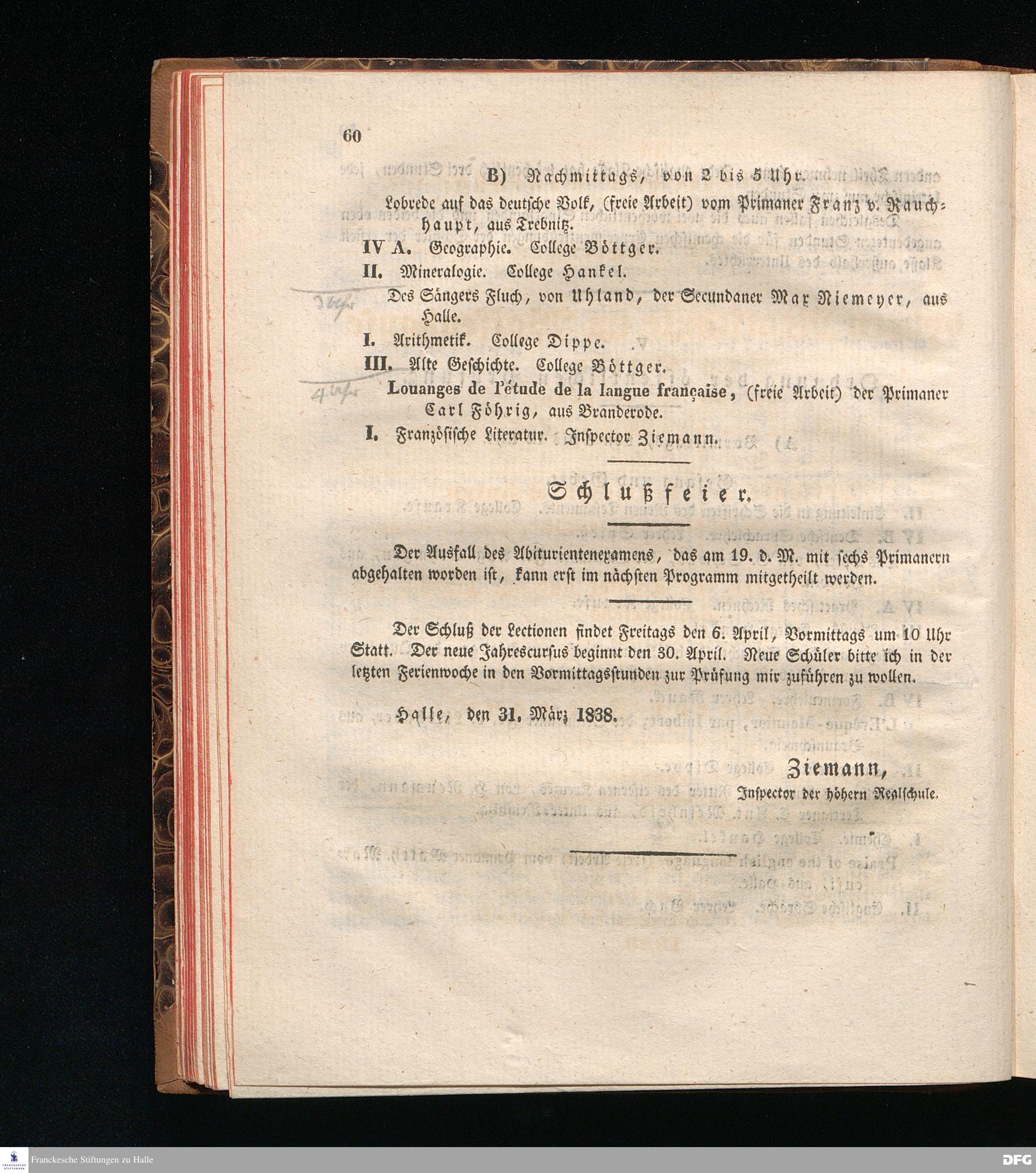 Zu der öffentlichen Prüfung, welche mit den Zöglingen der Realschule I. Ordnung im Waisenhause zu Halle am ... in dem Versammlungssaale des neuen Realschulgebäudes veranstaltet werden soll, werden ... eingeladen.