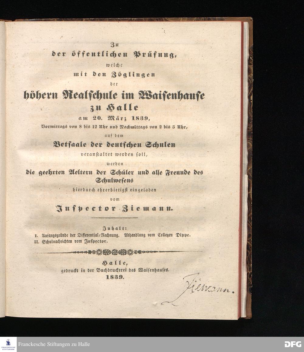 Zu der öffentlichen Prüfung, welche mit den Zöglingen der Realschule I. Ordnung im Waisenhause zu Halle am ... in dem Versammlungssaale des neuen Realschulgebäudes veranstaltet werden soll, werden ... eingeladen.