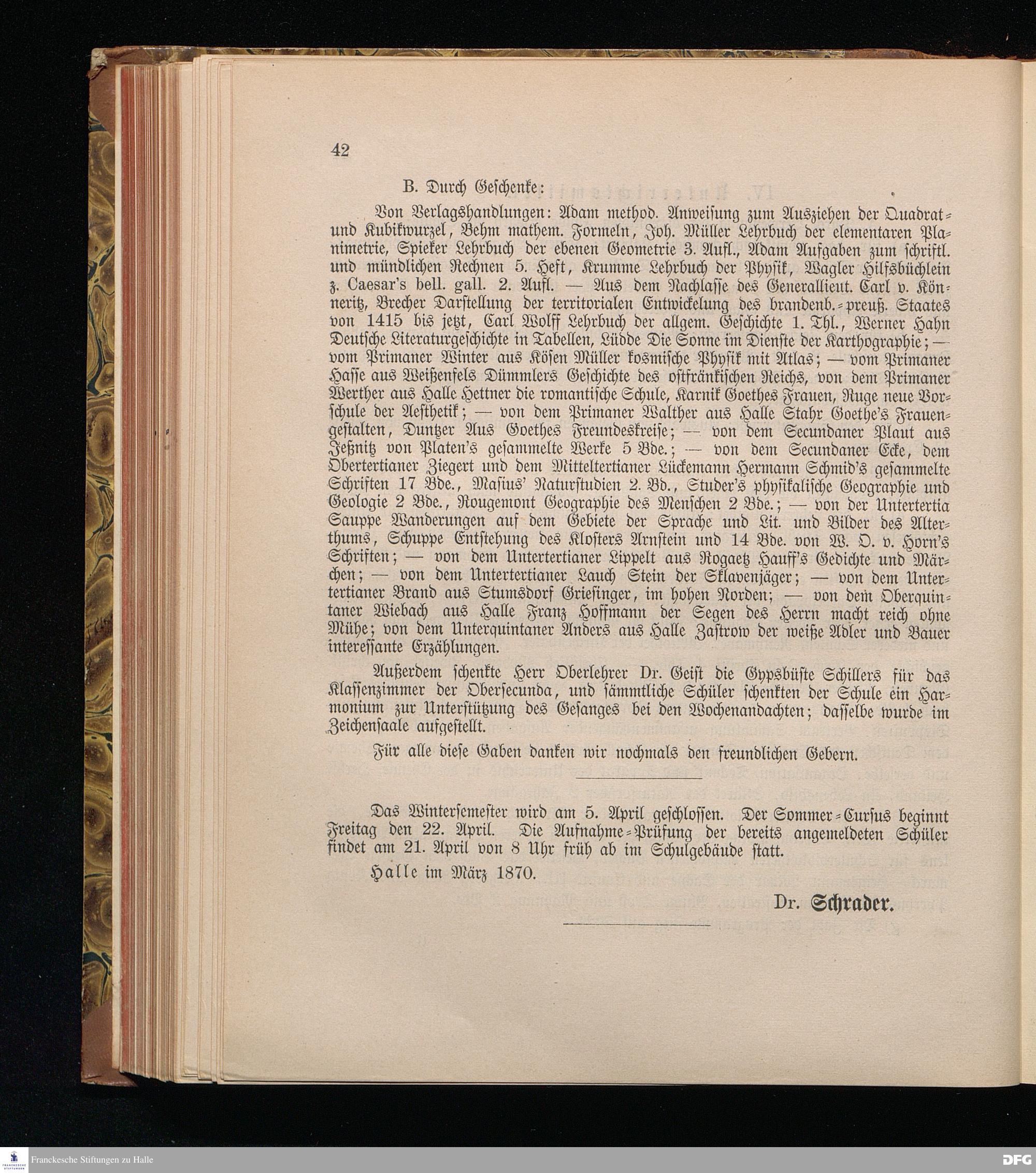 Zu der öffentlichen Prüfung, welche mit den Zöglingen der Realschule I. Ordnung im Waisenhause zu Halle am ... in dem Versammlungssaale des neuen Realschulgebäudes veranstaltet werden soll, werden ... eingeladen.