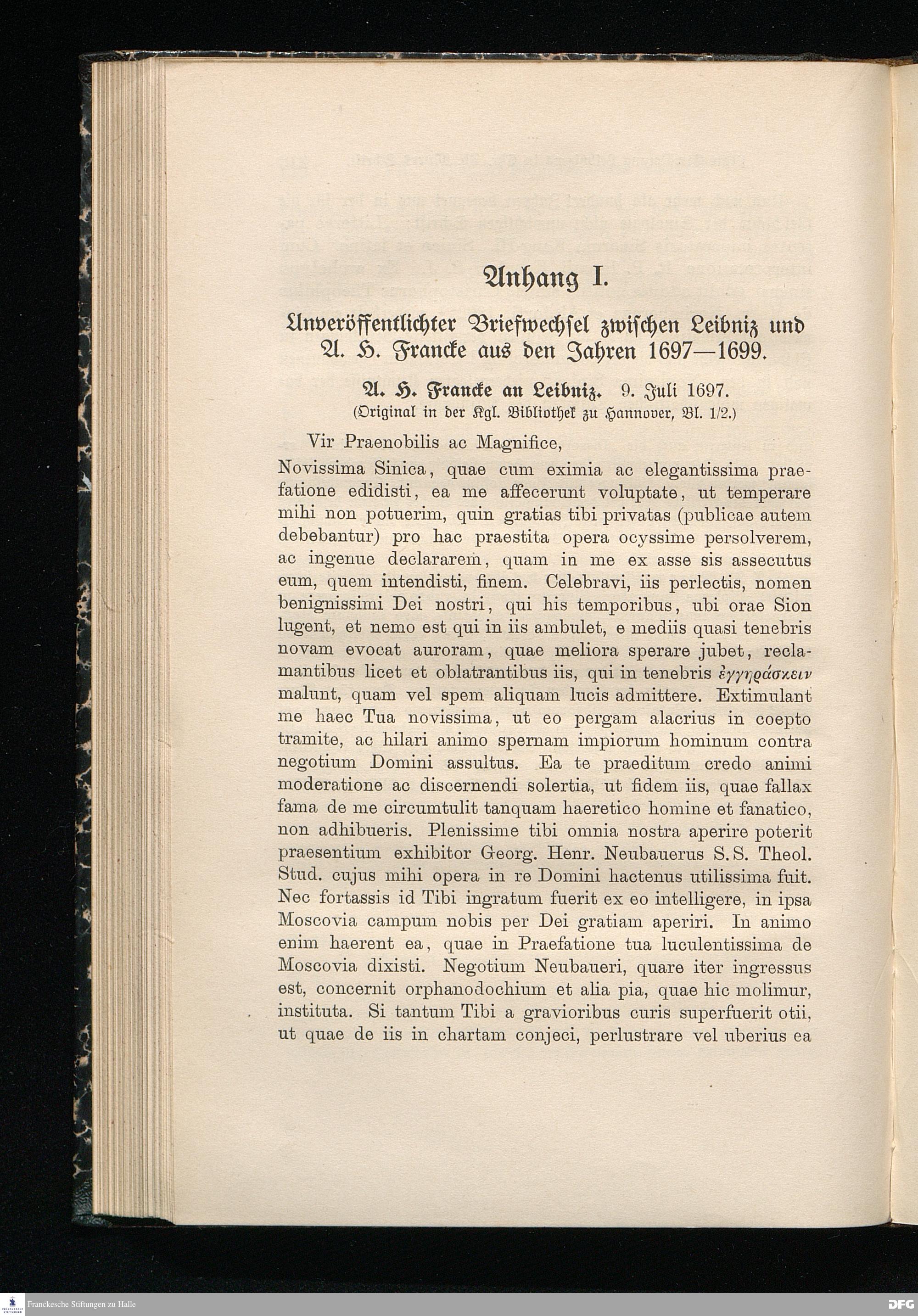 Anhang I. Unveröffentlichter Briefwechsel zwischen Leibniz und A. H. Francke aus den Jahren 1697-1699.