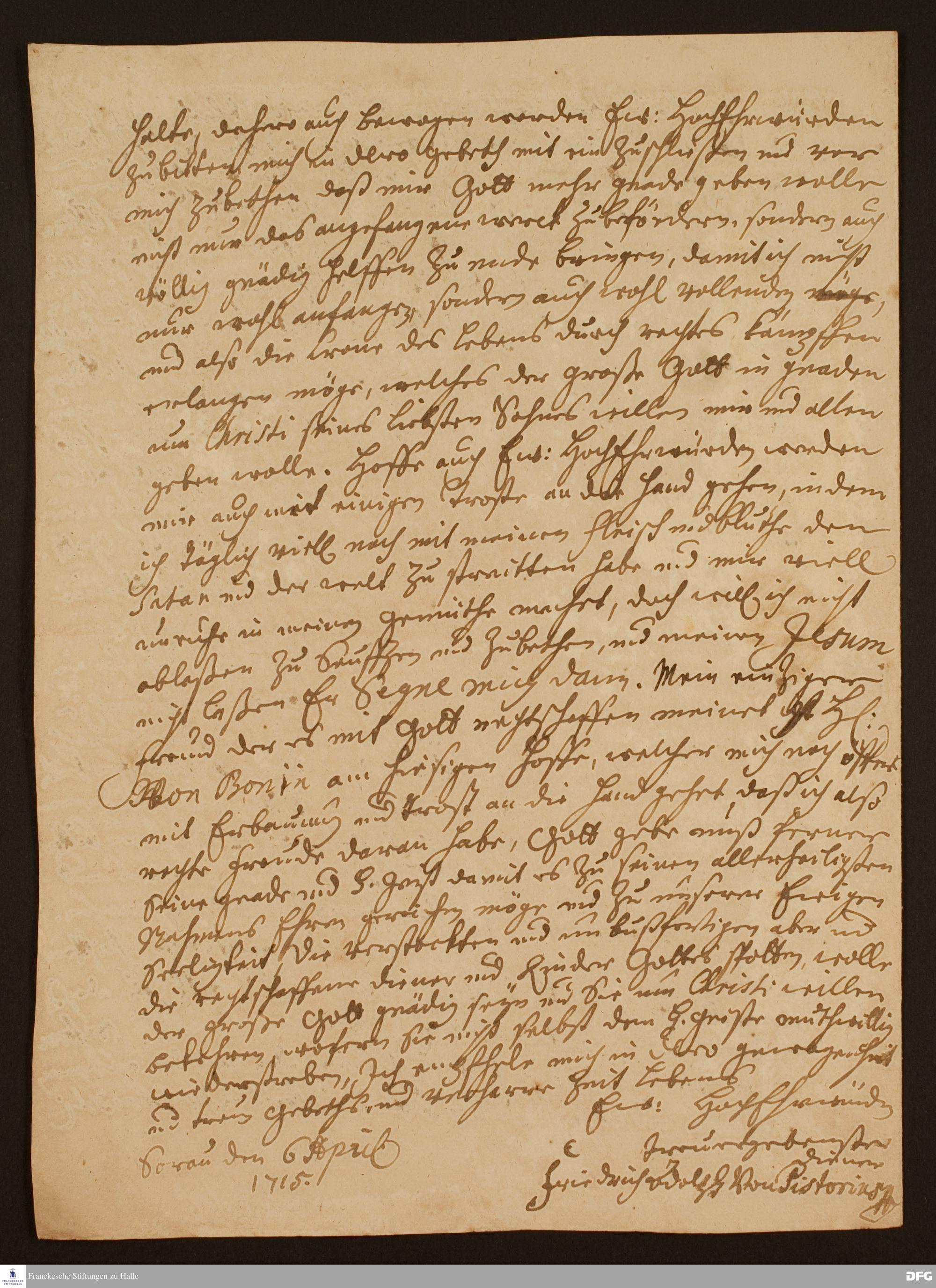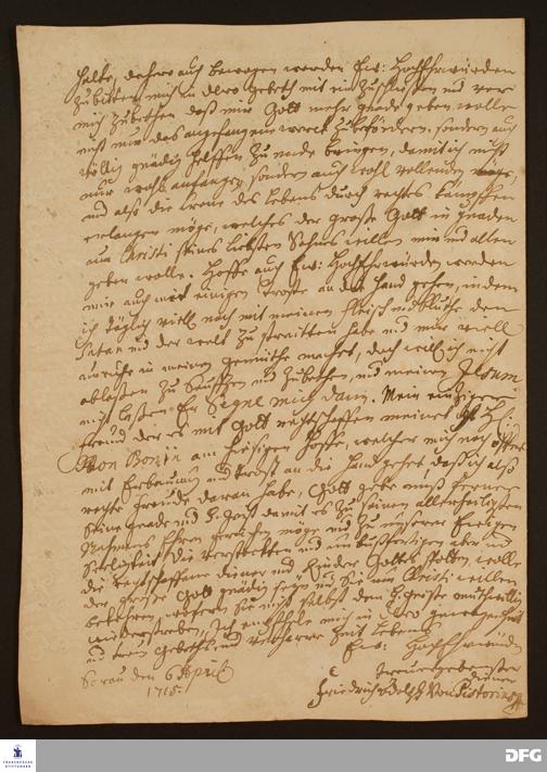 Brief von Friedrich Adolph v. Pistorius an August Hermann Francke.