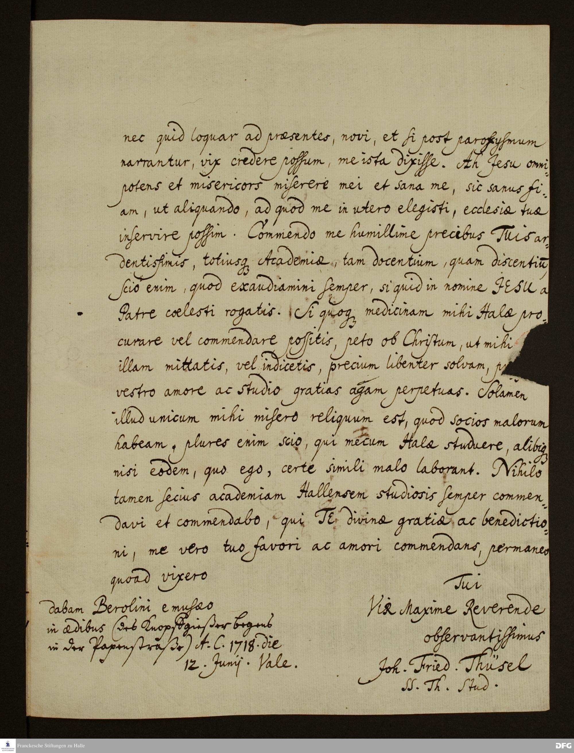 Brief von Johann Friedrich Thüsel an August Hermann Francke.
