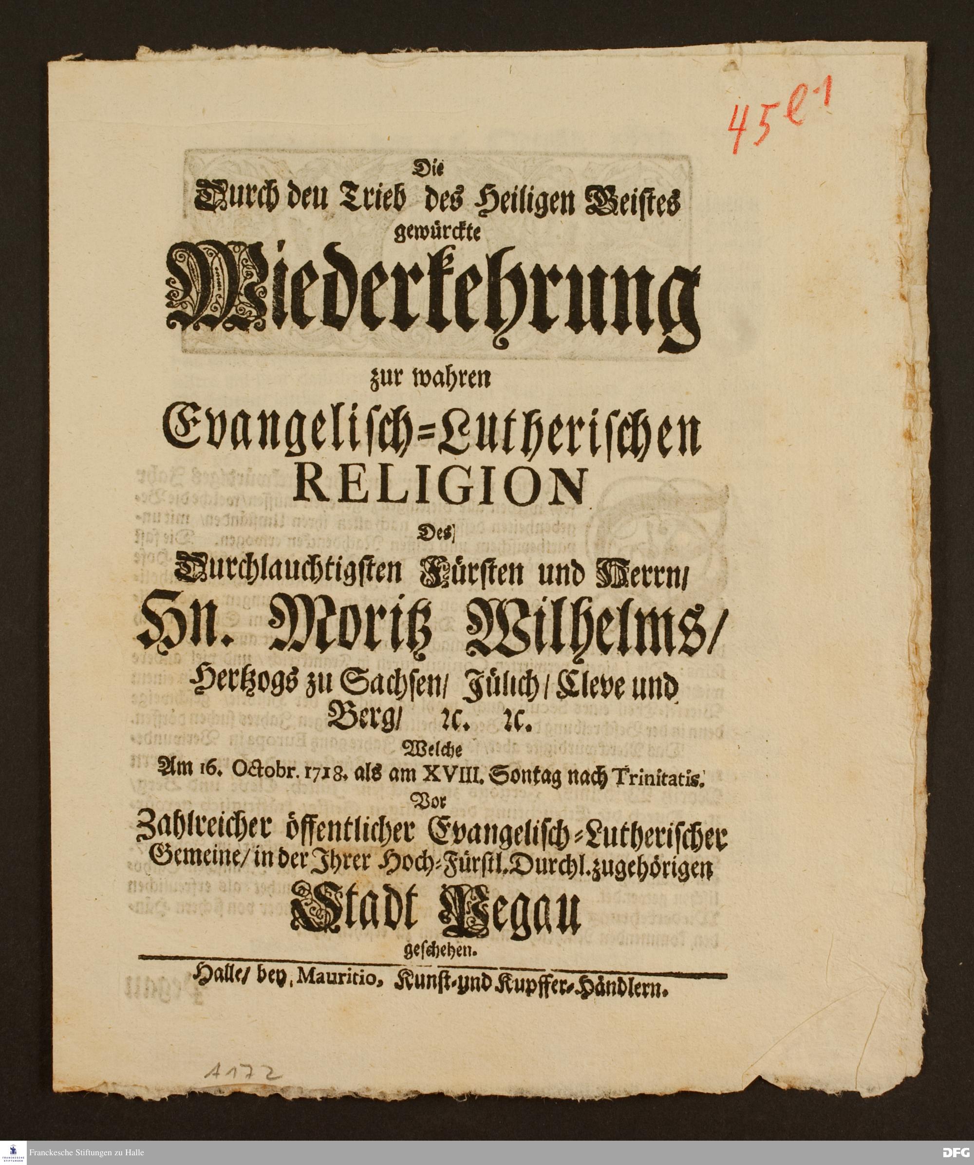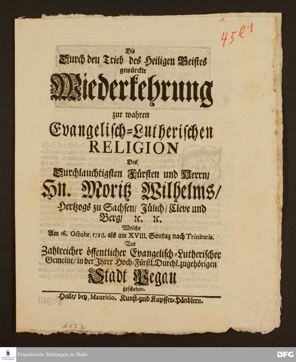 Die durch den Trieb des heiligen Geistes gewürckte Wiederkehrung zur wahren evangelisch-lutherischen Religion des durchlauchtigsten Fürsten und Herrn, Hn. Moritz Wilhelms, Hertzog zu Sachsen [...].