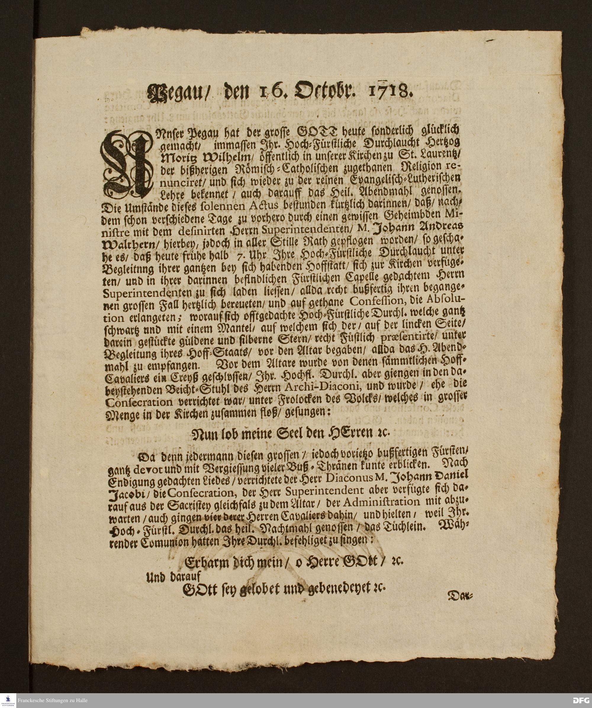 Die durch den Trieb des heiligen Geistes gewürckte Wiederkehrung zur wahren evangelisch-lutherischen Religion des durchlauchtigsten Fürsten und Herrn, Hn. Moritz Wilhelms, Hertzog zu Sachsen [...].