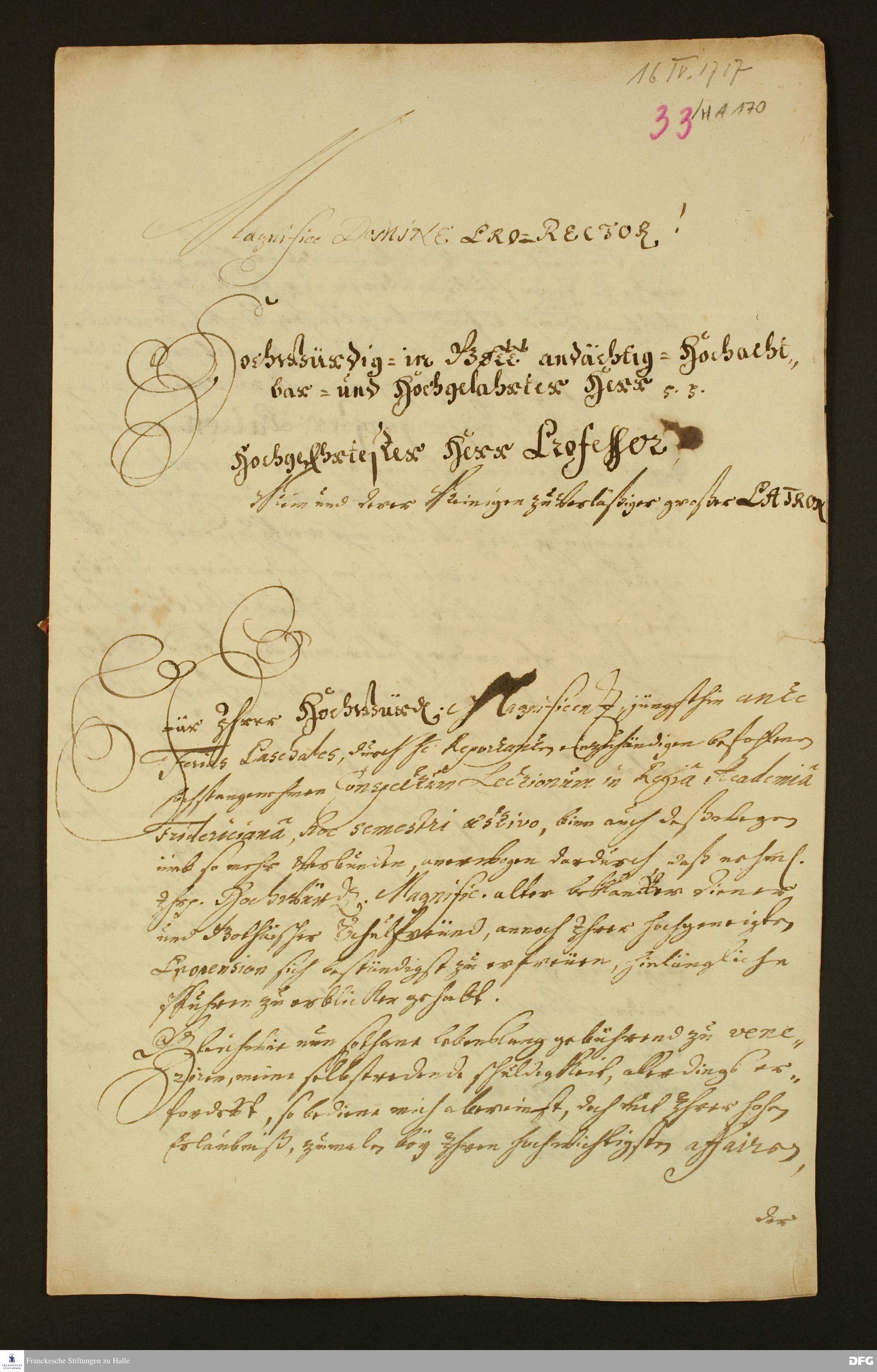 Brief von Benjamin Christoph Schreiber an August Hermann Francke.