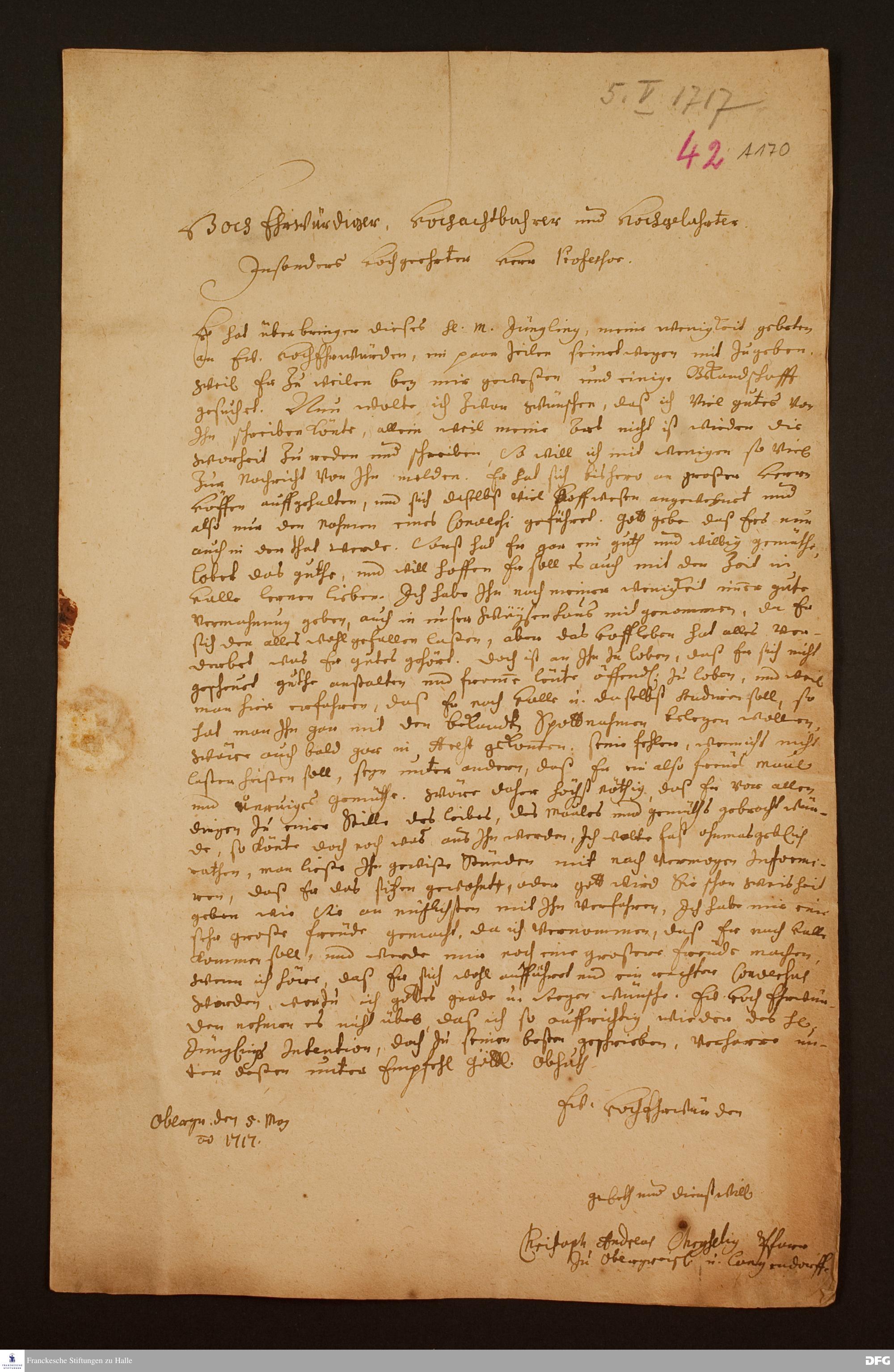 Brief von Christoph Andreas Chryselius an August Hermann Francke.