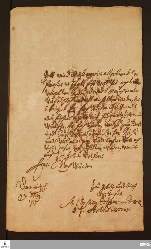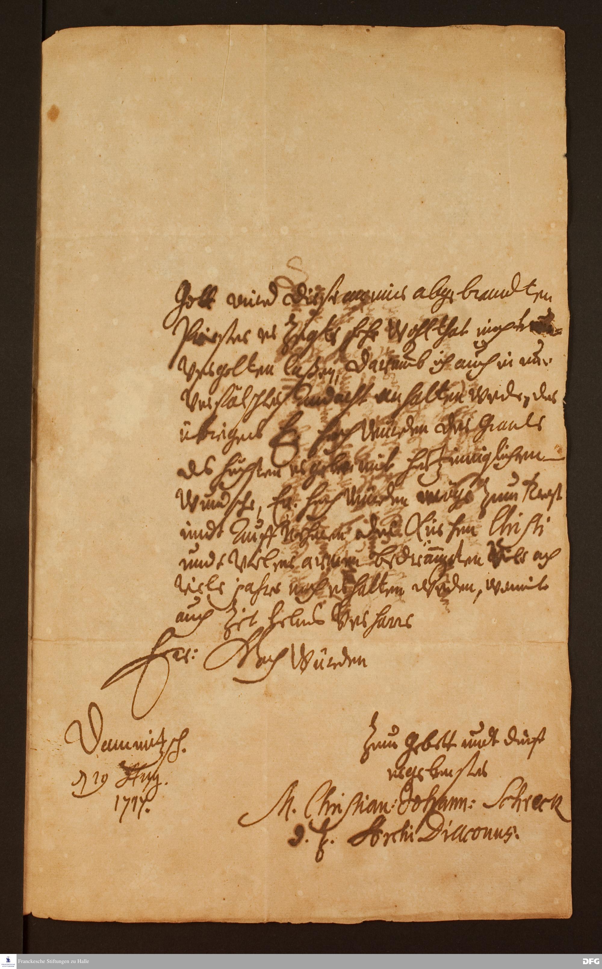 Brief von Christian Johann Schreck an August Hermann Francke.