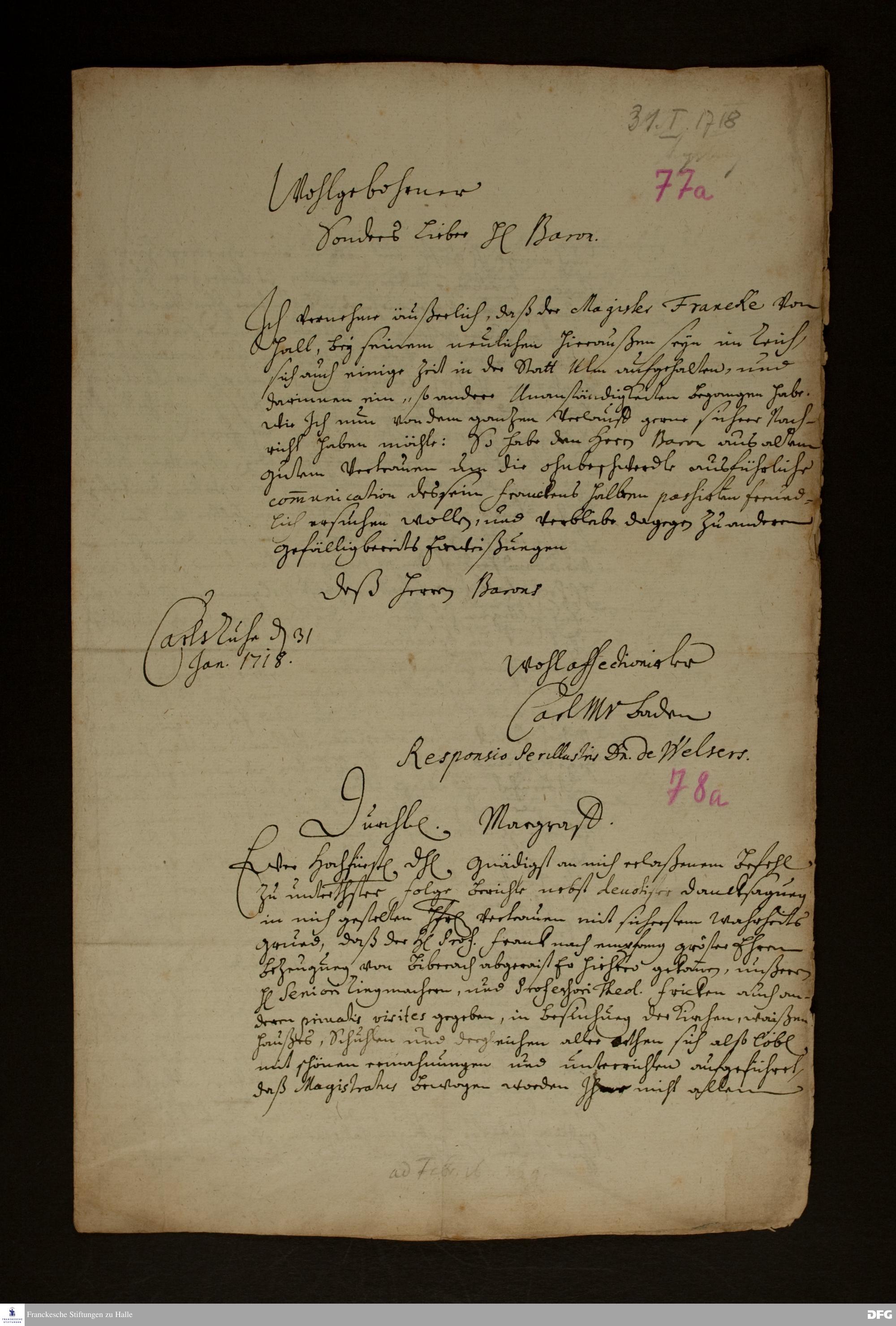Brief von Marx Christoph v. Welser an Karl III. Wilhelm v. Baden-Durlach.