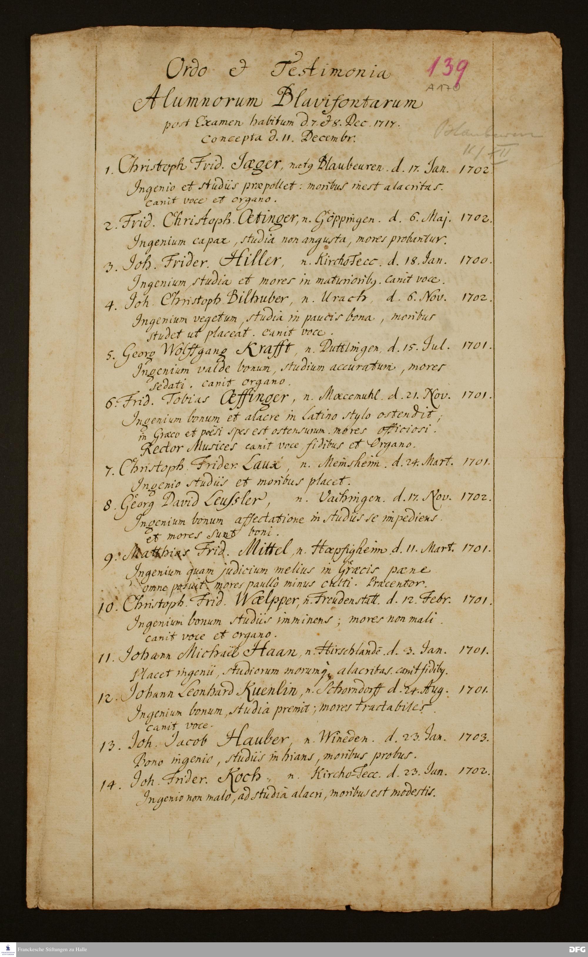 Verzeichnis der Schüler des Klosters Blaubeuren mit Beurteilung, angefertigt nach dem Examen am 7. und 8. Dezember 1717.