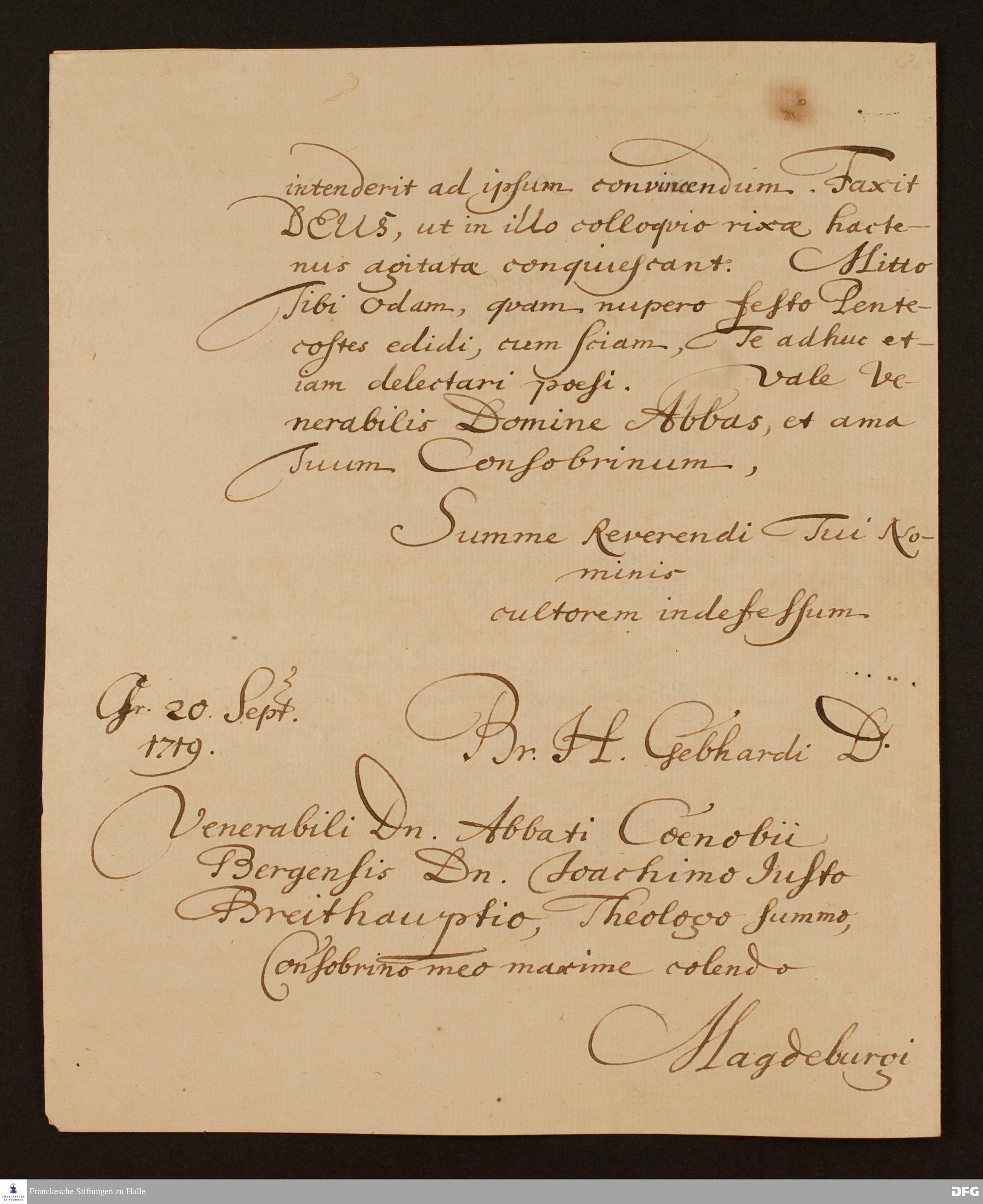 Brief von Brandanus Henricus Gebhardi an Joachim Justus Breithaupt.