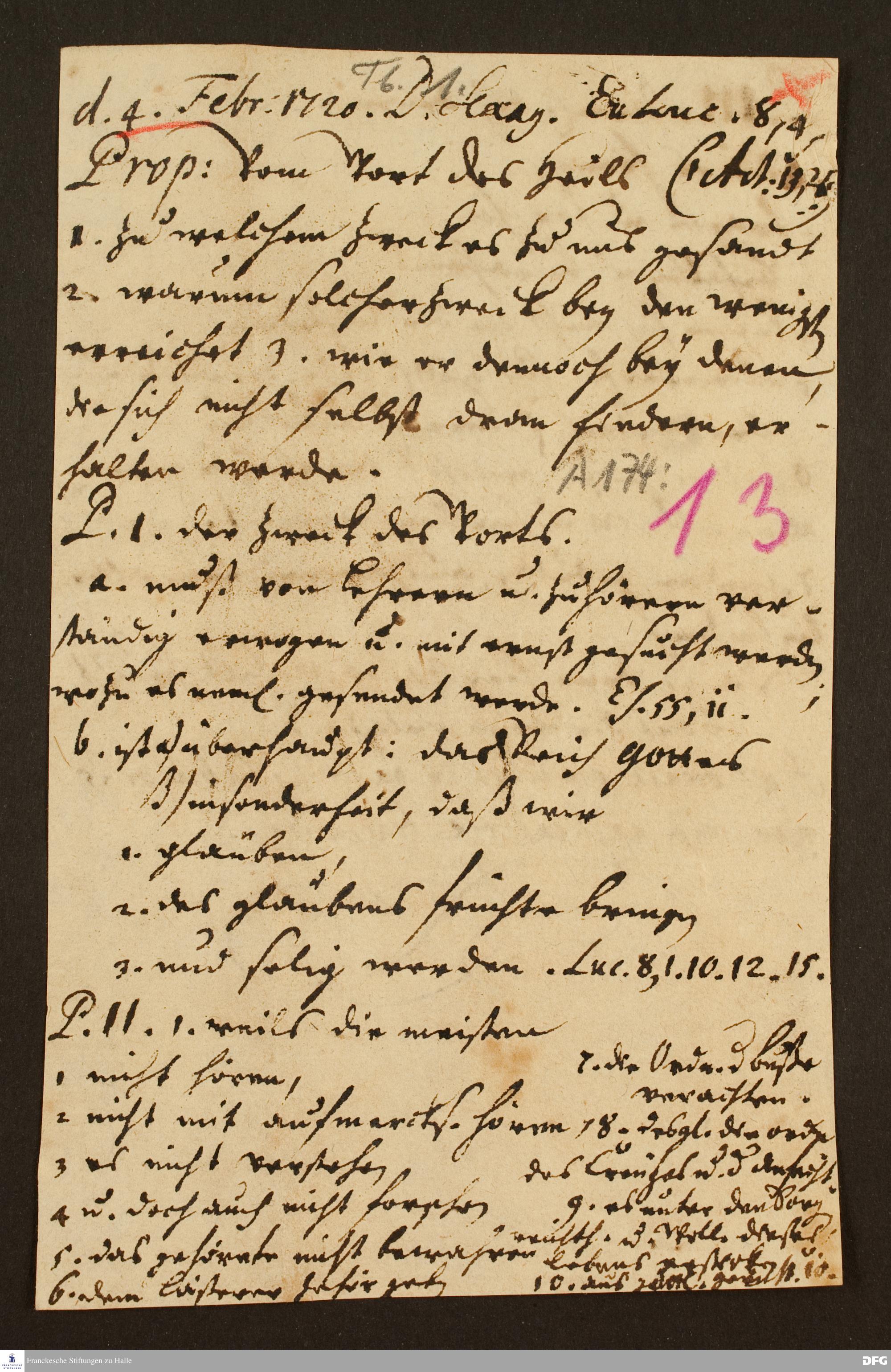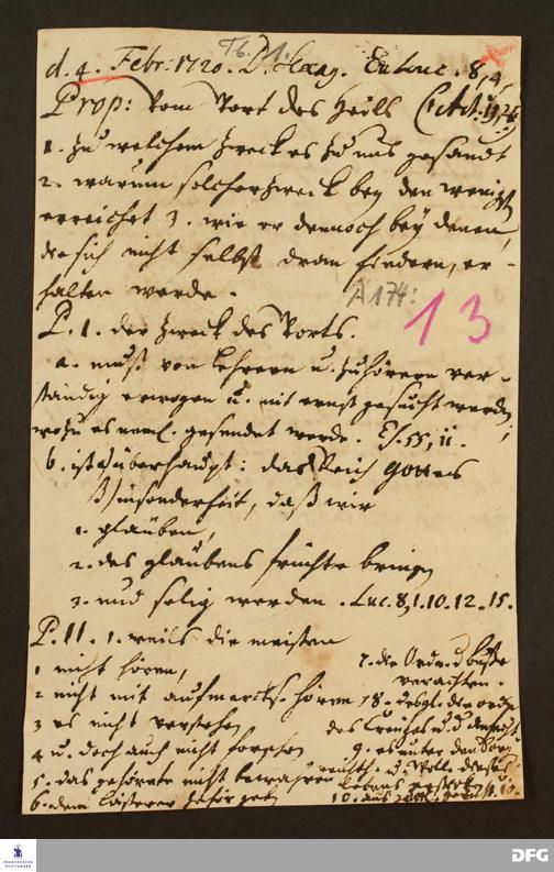 Disposition der Predigt von August Hermann Francke über Lk 8,4ff. am 04.02.1720.