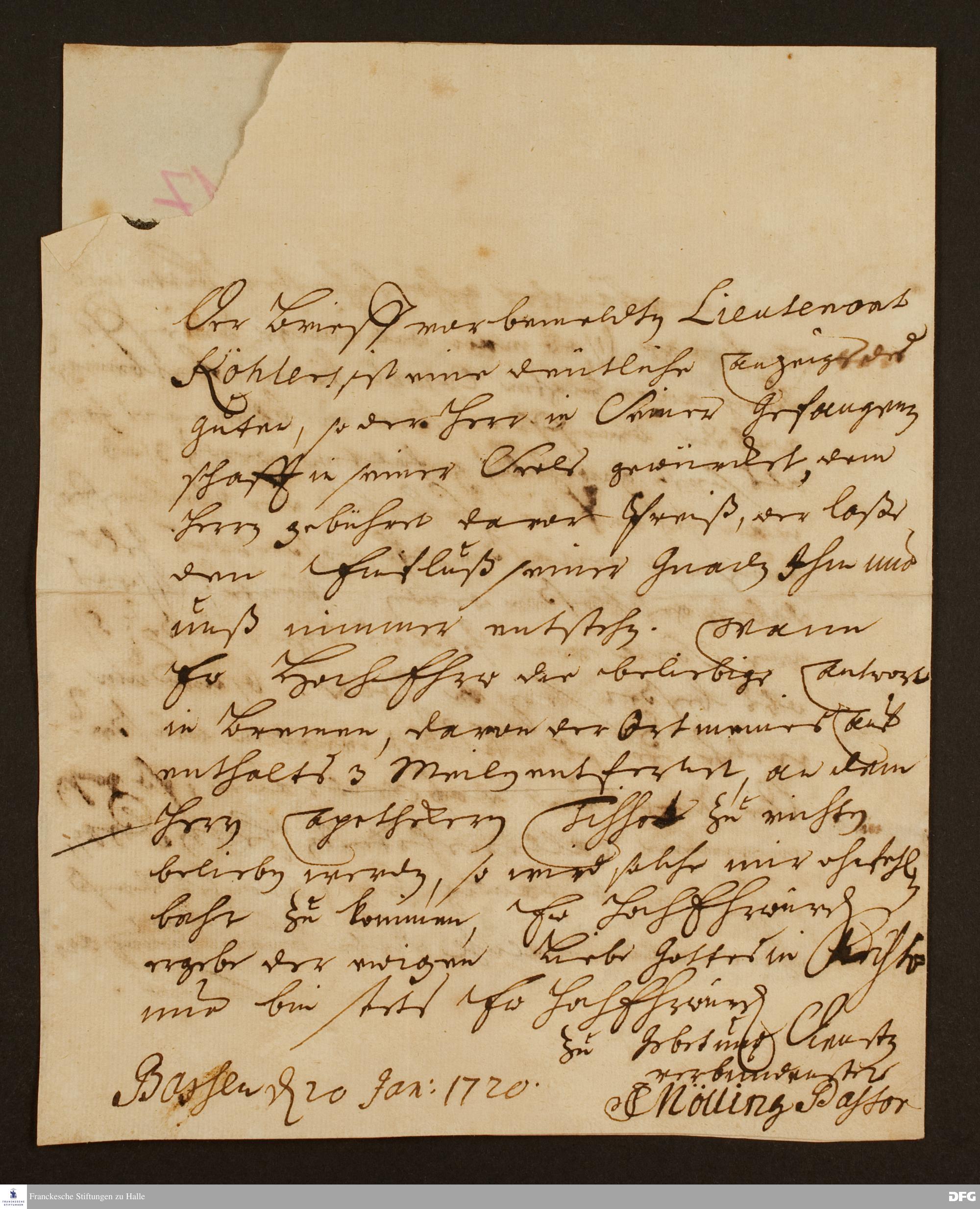 Brief von Christoph Jacob Mölling an August Hermann Francke.