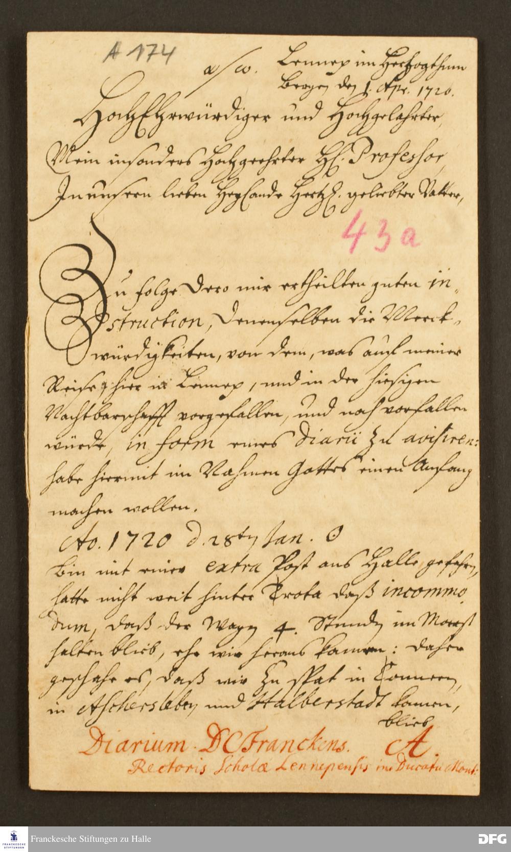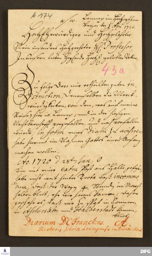 Reisetagebuch von Daniel Christian Francke an August Hermann Francke.