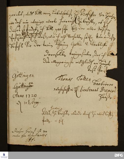 Brief von Thomas Tollen an August Hermann Francke.