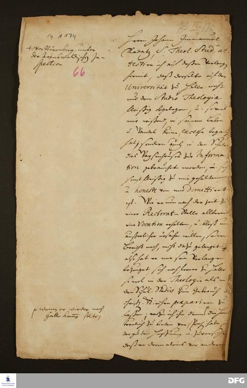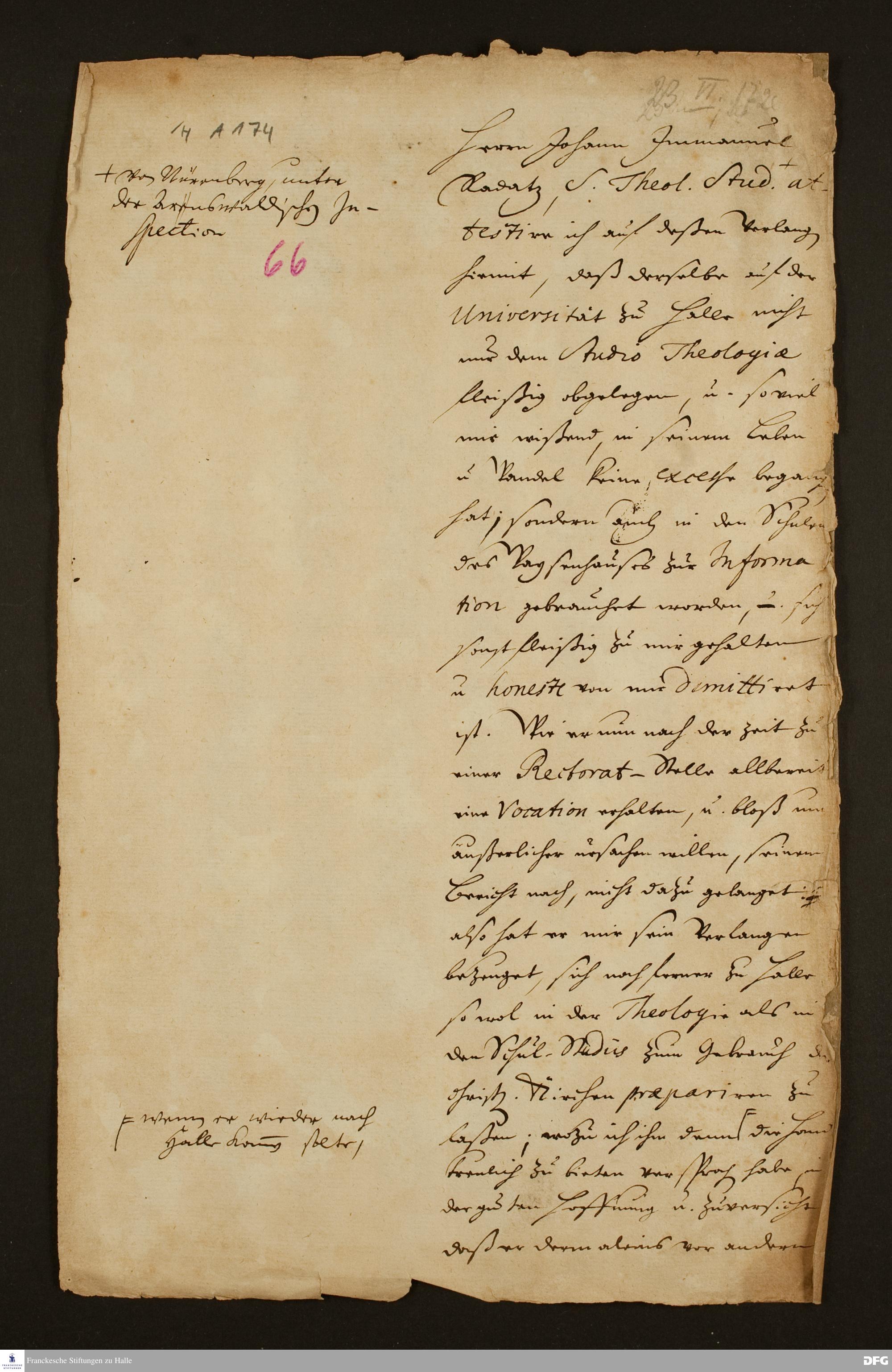 Testimonium von August Hermann Francke für Johann Immanuel Radatz.
