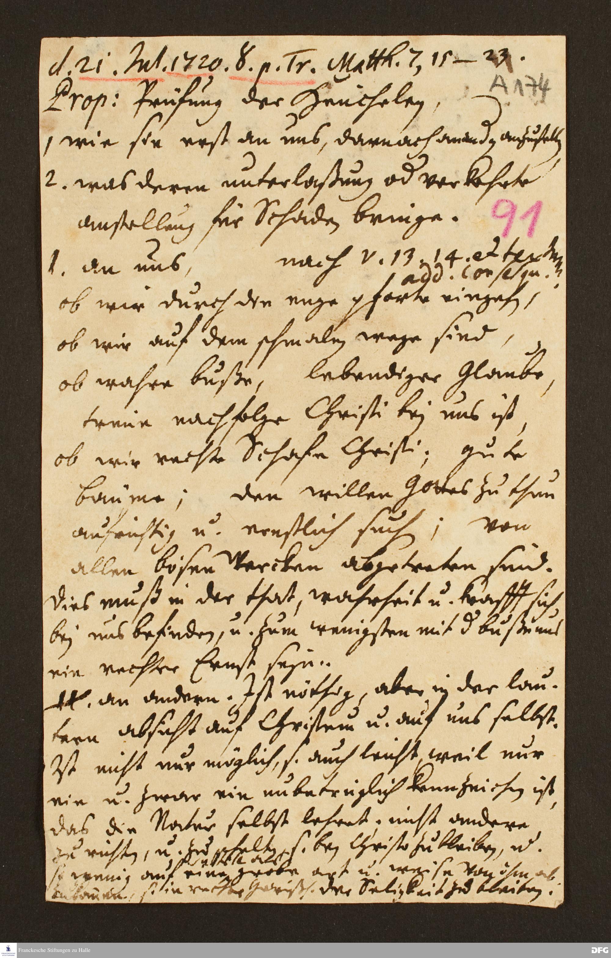 Disposition der Predigt von August Hermann Francke über Mt 7,15-23 am 21.07.1720.