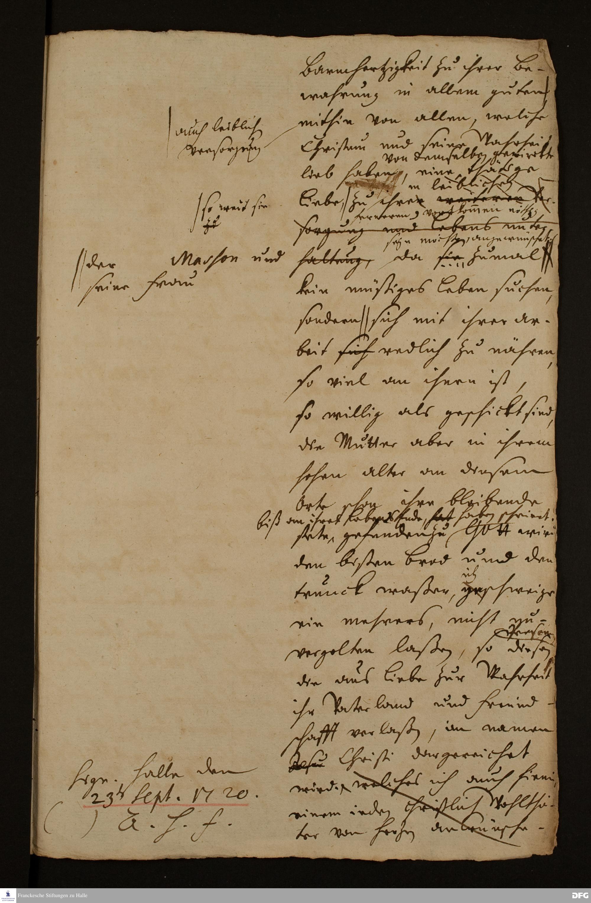 Attestat von August Hermann Francke für die Familie Masson.