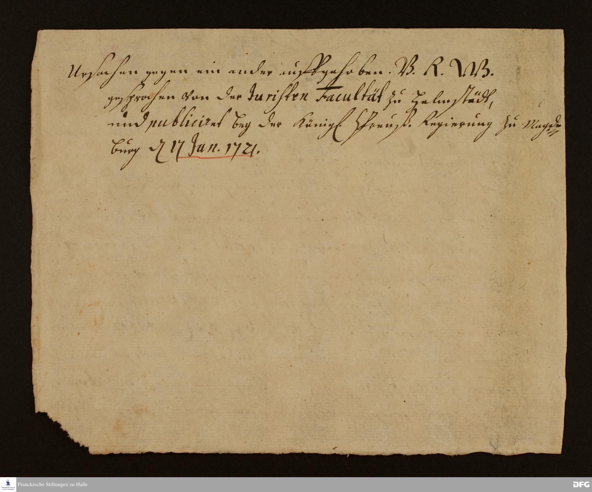 Urteil im Prozess der Glauchaschen Anstalten und der Armenkasse zu Halle gegen die Erben Carl Anton Philipps v. Münchhausen, übersendet von Christoph Andreas Schubart.