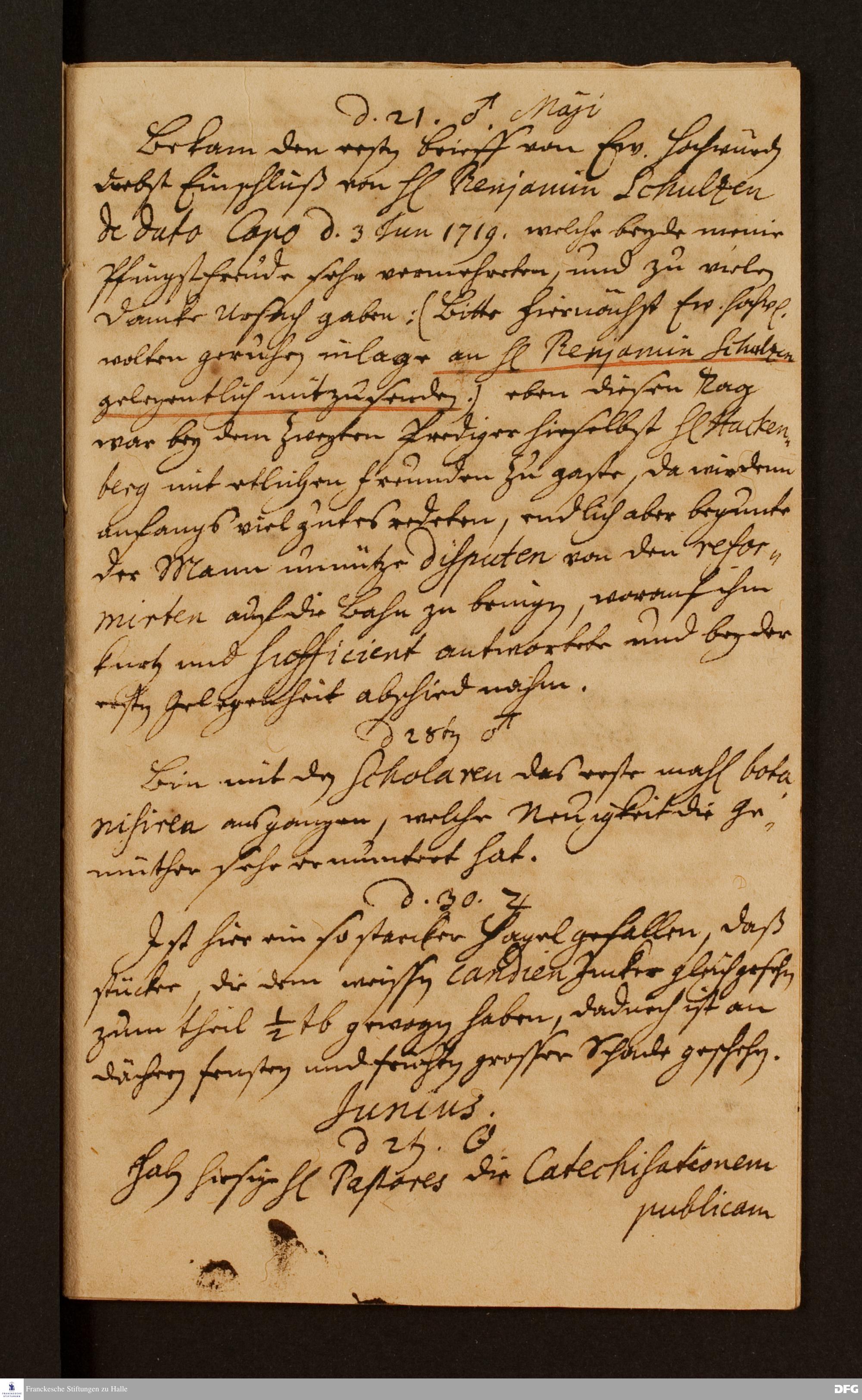 Tagebuch von Daniel Christian Francke an August Hermann Francke.