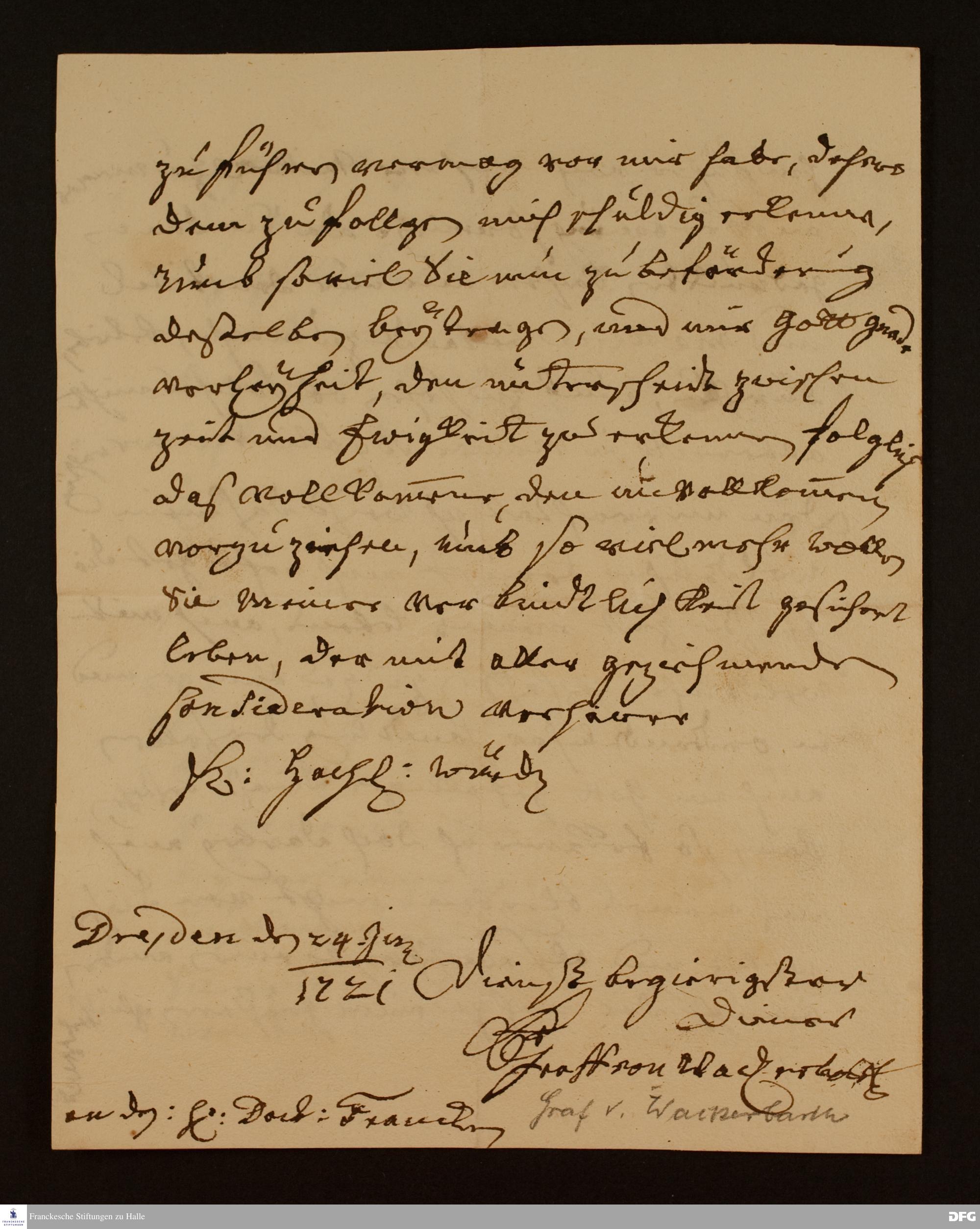Brief von August Christoph v. Wackerbarth an August Hermann Francke.