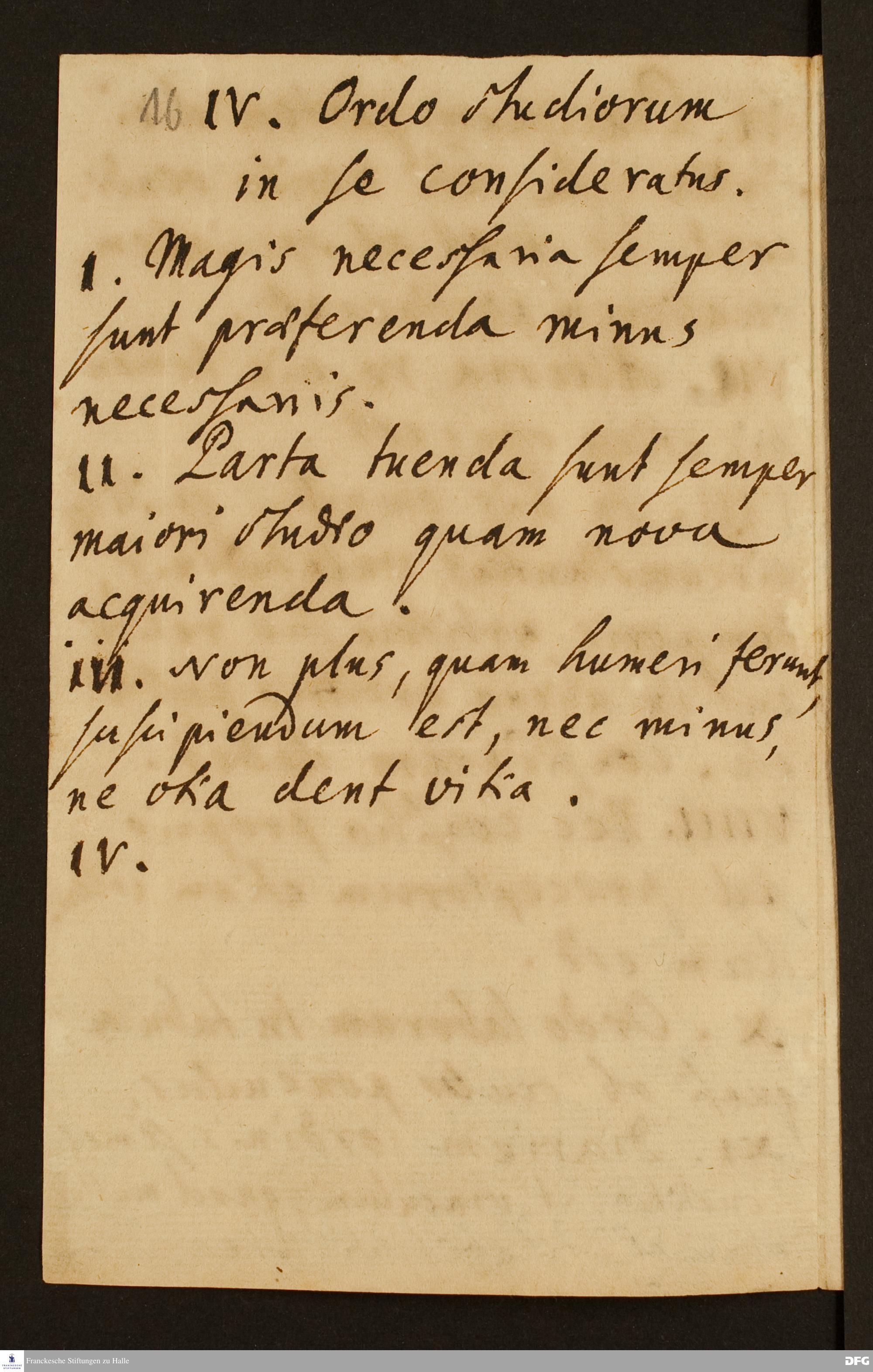 Disposition des Collegium paraeneticum methodologicum von August Hermann Francke am 14.04.1722.