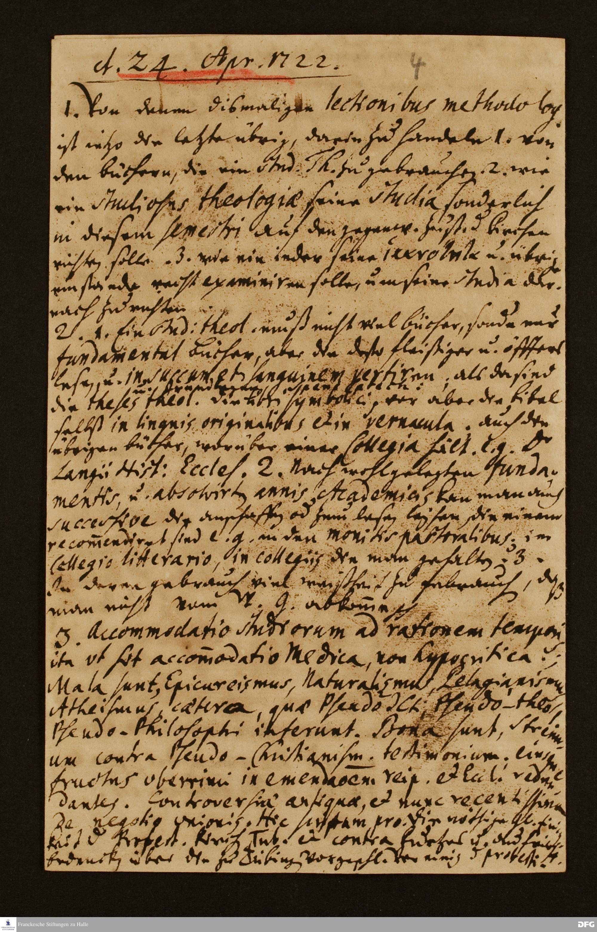 Disposition des Collegium paraeneticum methodologicum von August Hermann Francke am 23. und 24.04.1722