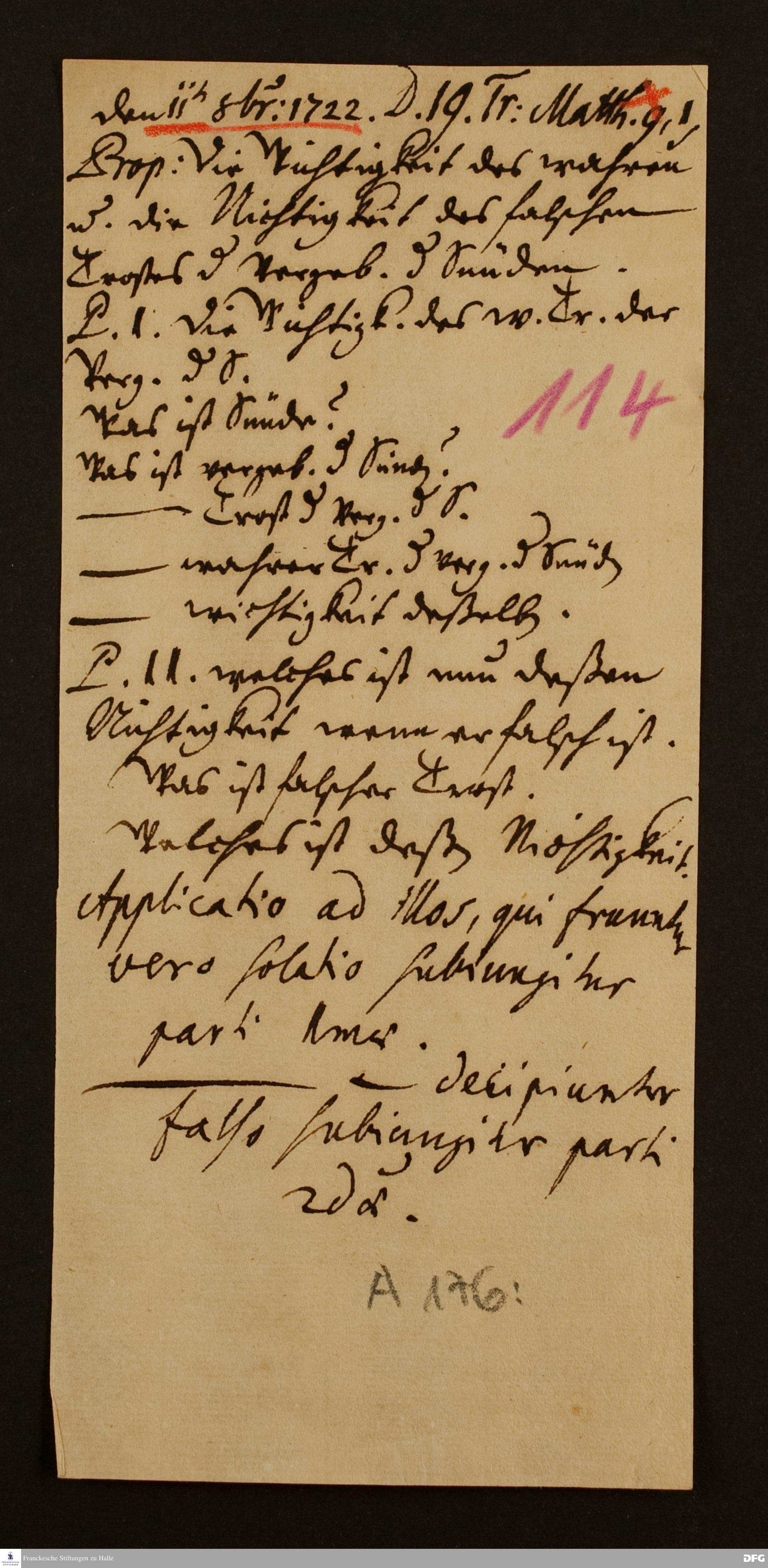Disposition der Predigt von August Hermann Francke über Mt 9,1ff. am 11.10.1722.