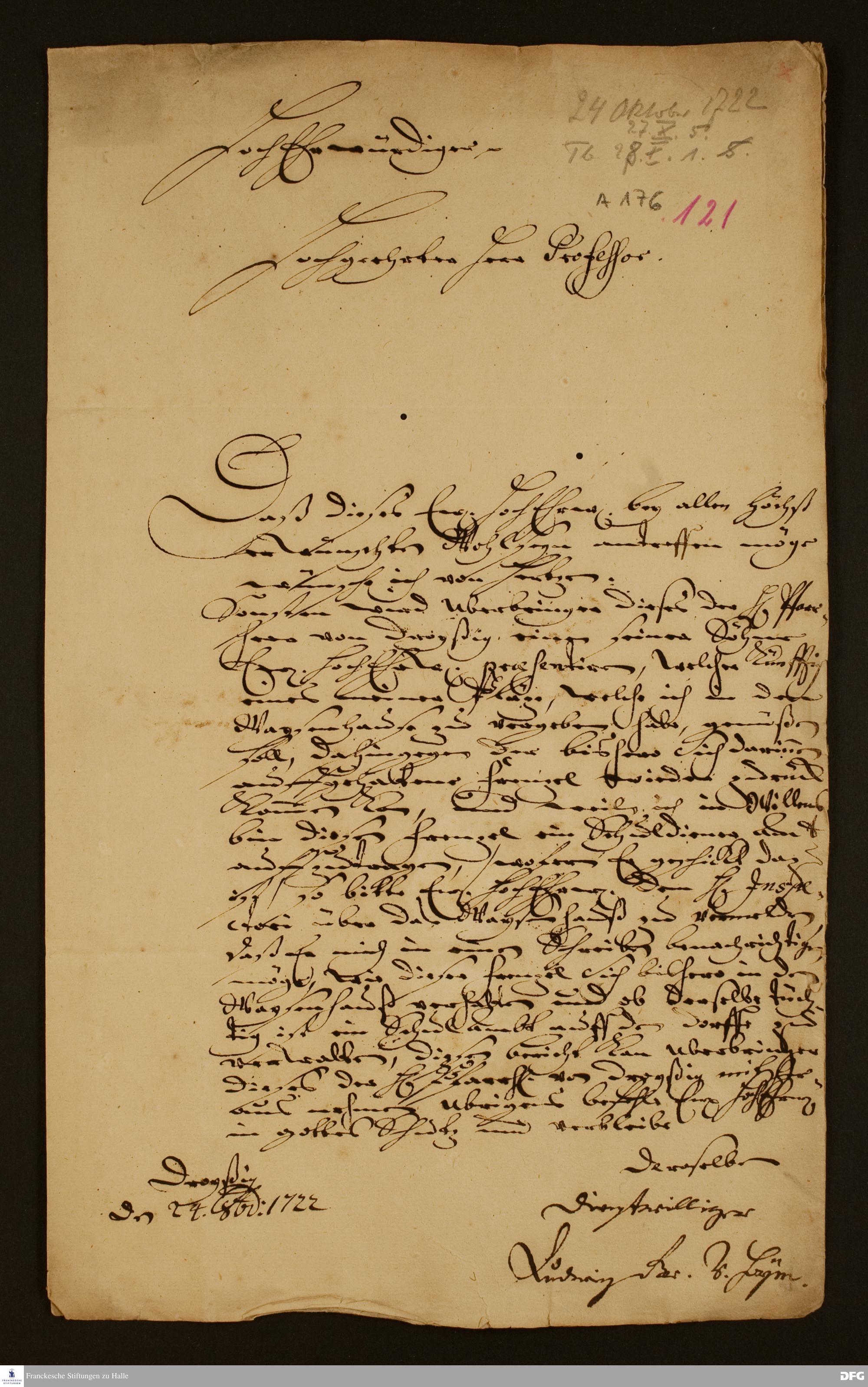 Brief von Ludwig Gebhard v. Hoym an August Hermann Francke.