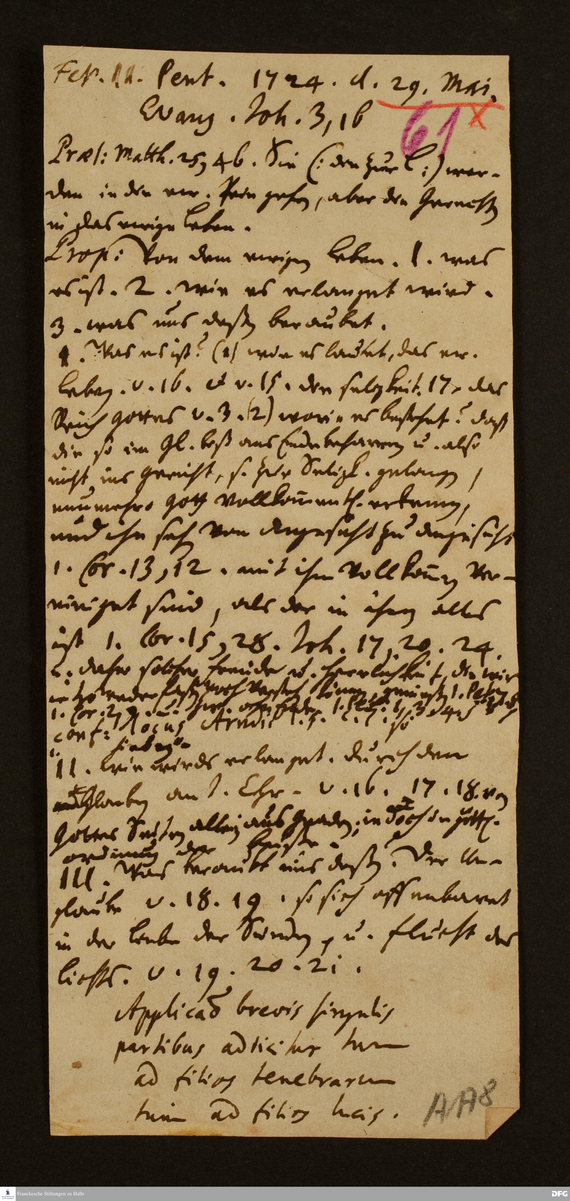 Disposition der Predigt von August Hermann Francke über Joh. 3,16 am 29.05.1724.