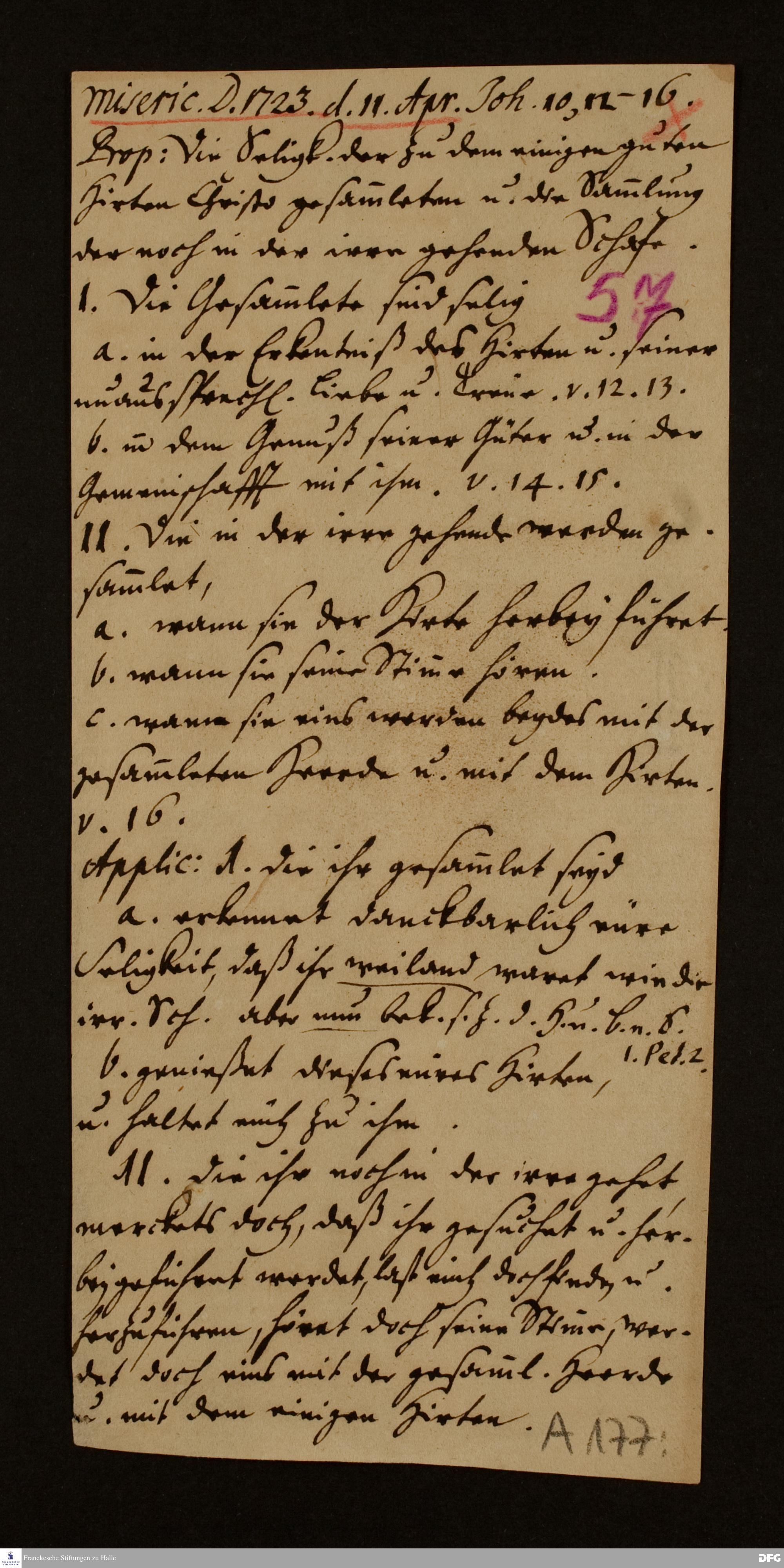 Disposition der Predigt von August Hermann Francke über Joh 10,12-16 am 11.04.1723.