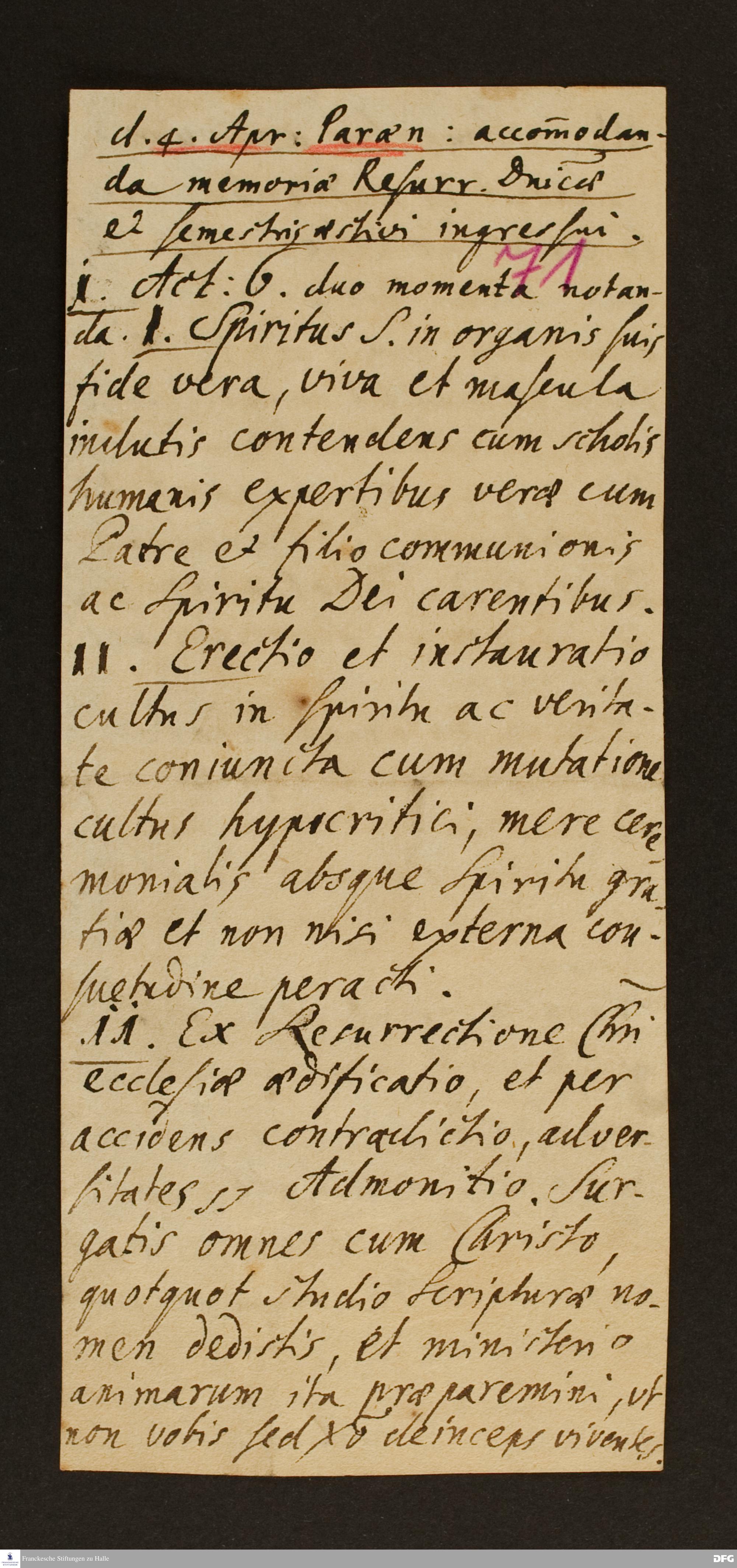 Disposition der paränetischen Vorlesung von August Hermann Francke am 04.04.[1720 ?].